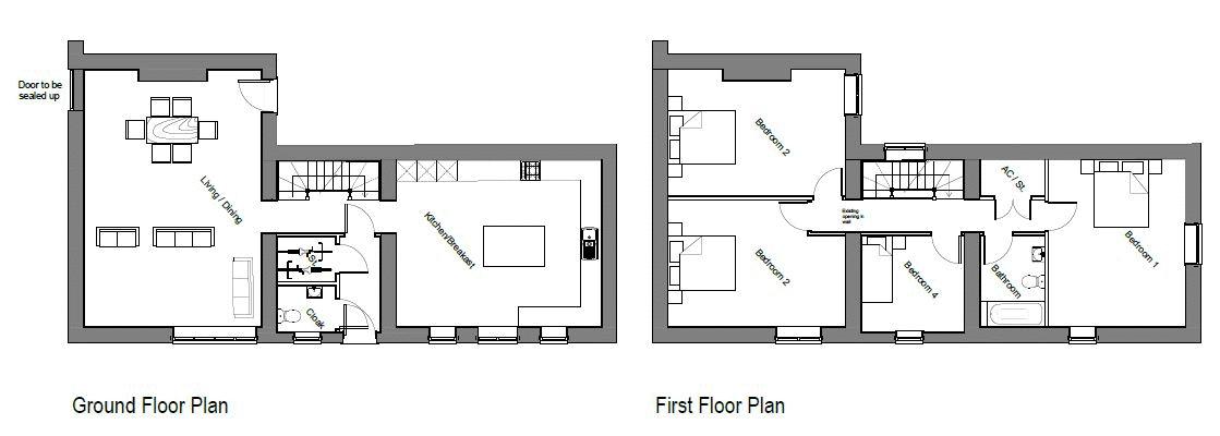 Two storey stone barn (182m²), attached to the existing farmhouse, with consent for conversion to a four bedroom dwelling with garden and parking. The ground floor accommodation consists of living / dining room, kitchen / breakfast room, bike store and cloakroom, with the first floor providing four bedrooms, a study and a family bathroom.