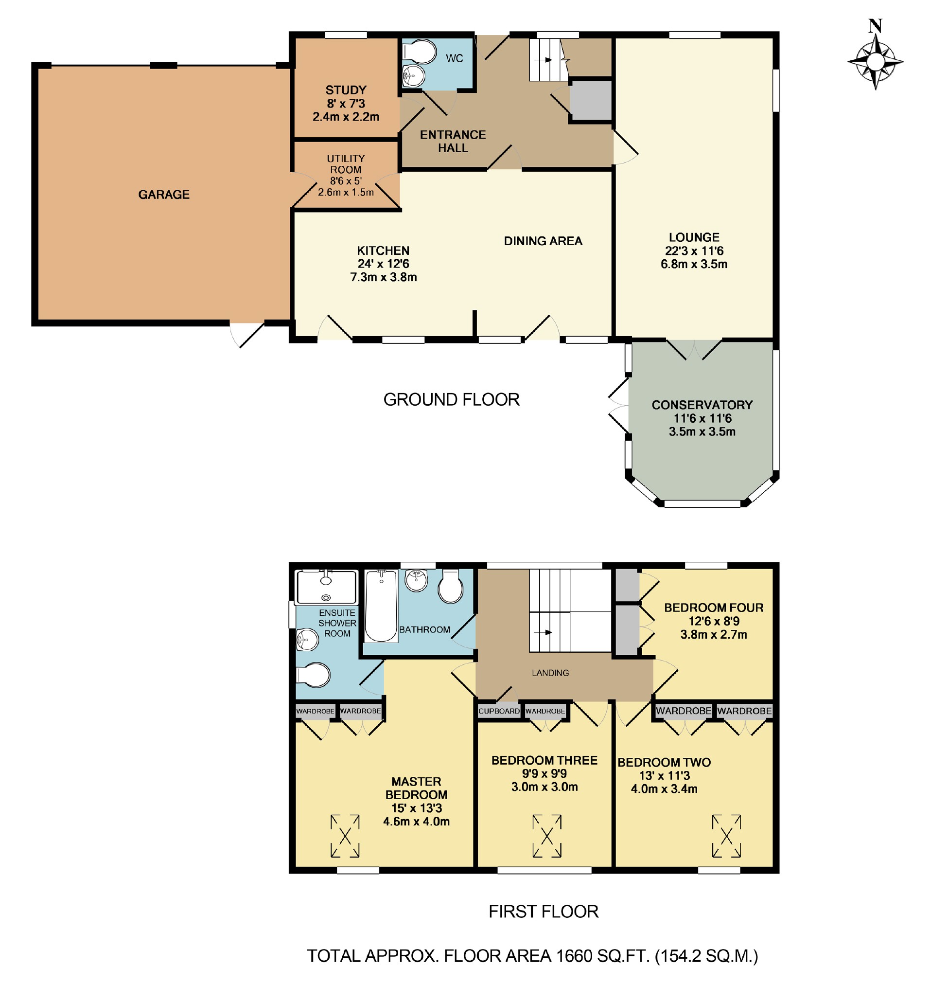 On the first floor the landing leads to the master bedroom, with a vaulted ceiling, exposed beams, fitted wardrobes and en suite shower room, second and third double bedrooms, a good sized fourth bedroom with a fitted storage cupboard, house bathroom with bath, w/c and hand basin. There is a useful storage cupboard on the landing.