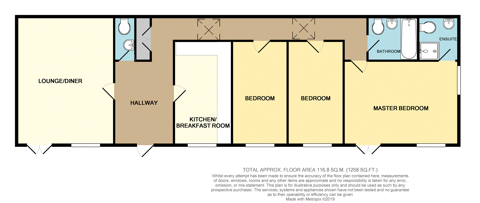 A comprehensive range of base, wall and drawer units with worktops over incorporating a 1 1/2 stainless steel sink drainer and mixer tap. Integrated dishwasher. Integrated fridge freezer. Integrated washing machine. Breakfast bar. Space for range style oven with extractor hood over. Tiled splash backs. Recess spotlights. UPVC double glazed window to front.
