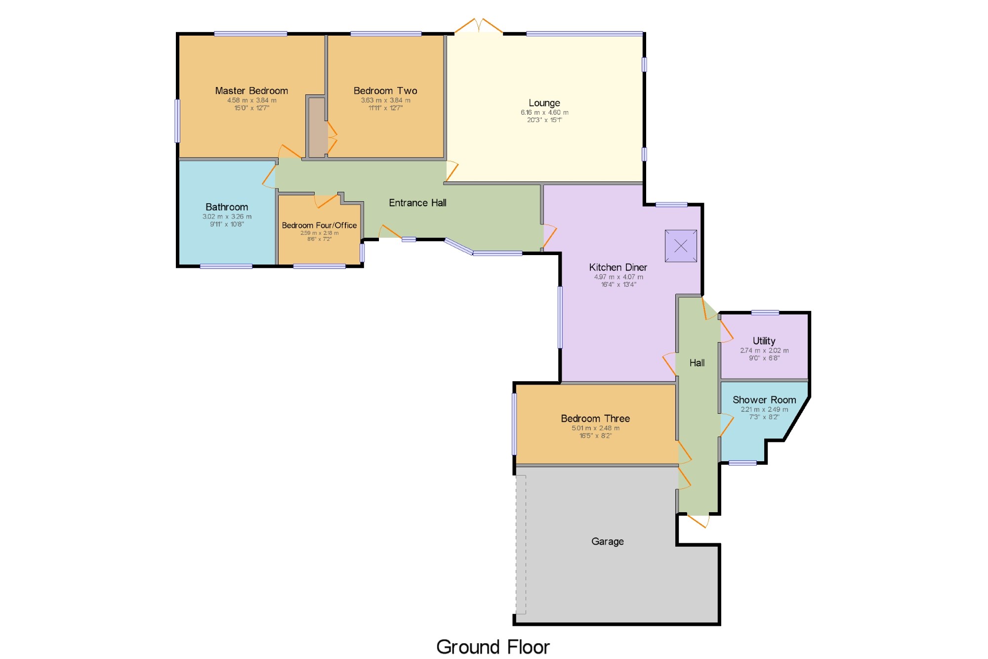 Entrance Hall x . Large hall area that can be used as a study. Access to the lounge, kitchen, bathroom, Master bedroom and Bedroom four/Study. Double glazed UPVC windows facing the front and folding ladder access to the roof space.