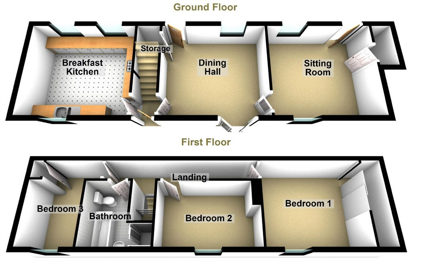 With exposed wooden flooring, central heating radiator and pine latch doors providing access to bedrooms and bathroom.