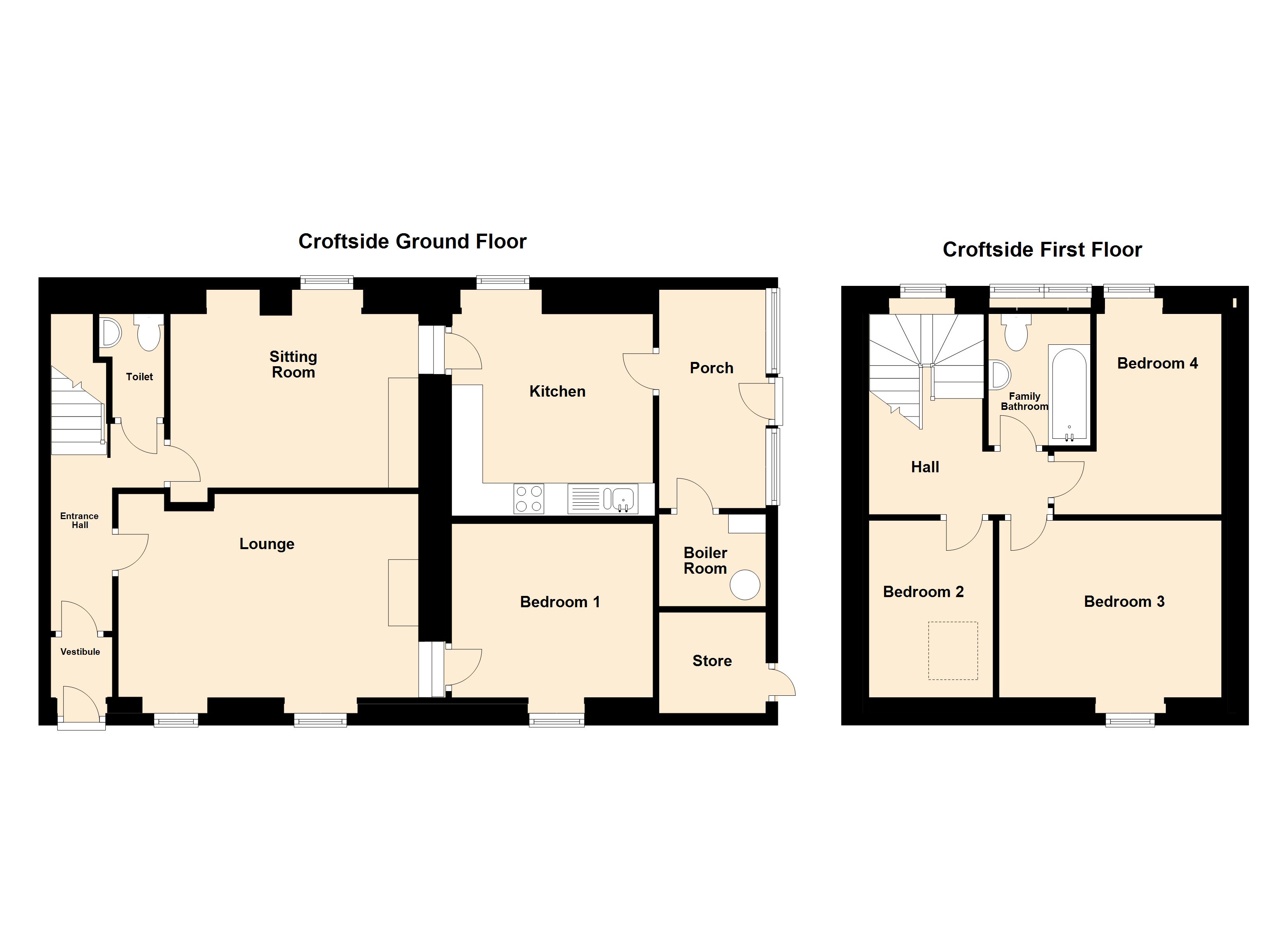 Croftside is situated a few minutes walk from the shore in Lamlash, it is a blond sandstone traditional semi-detached cottage villa. Accommodation comprises hallway, lounge, sitting room, kitchen, porch, toilet, downstairs bedroom and on the upper floor three further bedrooms and family bathroom.