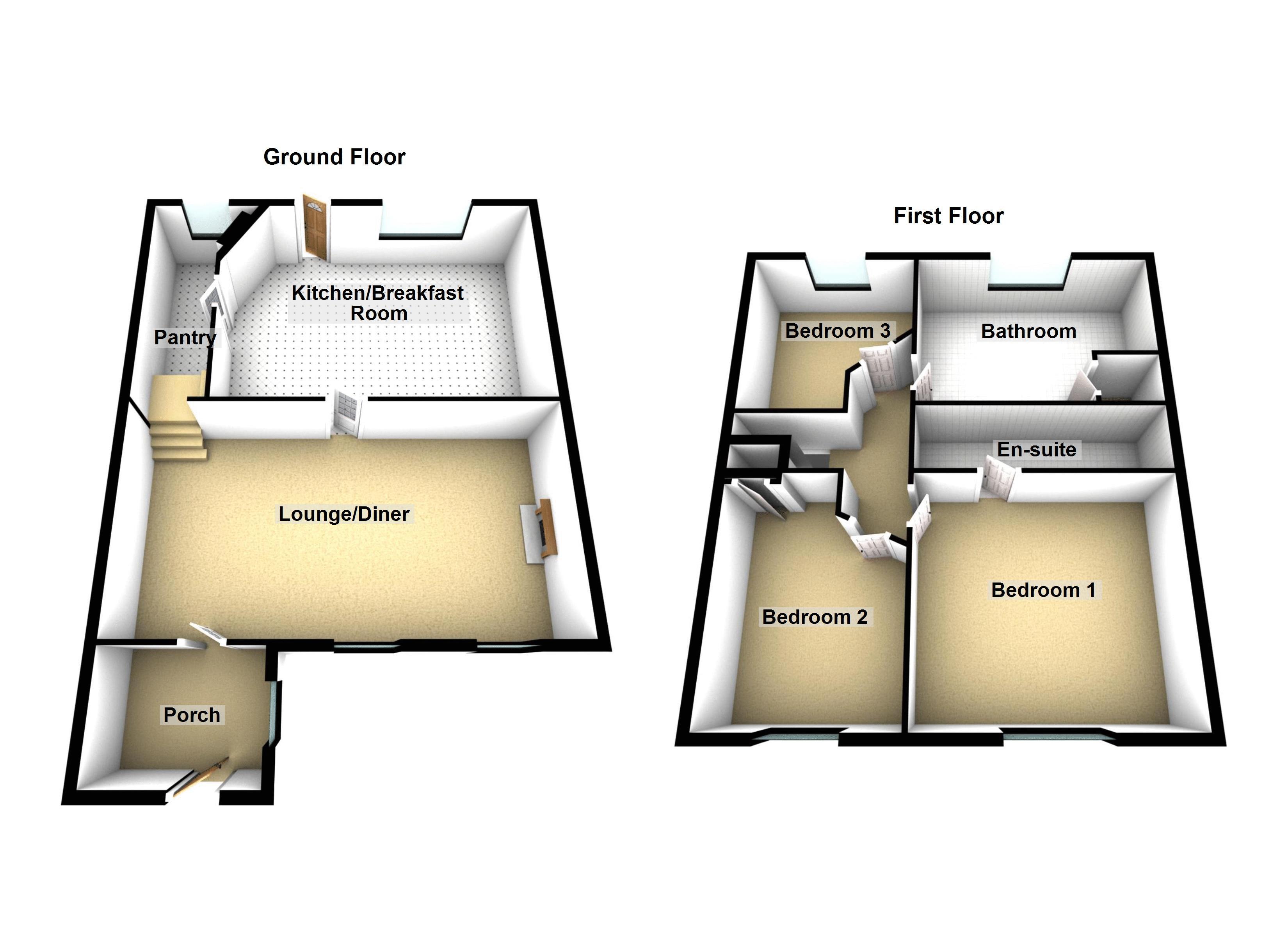 To the ground floor you have a usable entrance porch which leads into the lounge / diner with exposed beams and an open fireplace, plus a kitchen / breakfast room with the feature of a walk-in pantry.