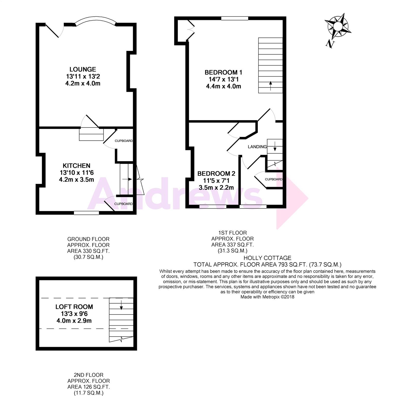 Upstairs there are two bedrooms and a bathroom. The master bedroom is a good size and has access to the loft space which could be used as a study. The second bedroom is smaller but would fit a double bed. The bathroom has shower over the bath, WC and sink.