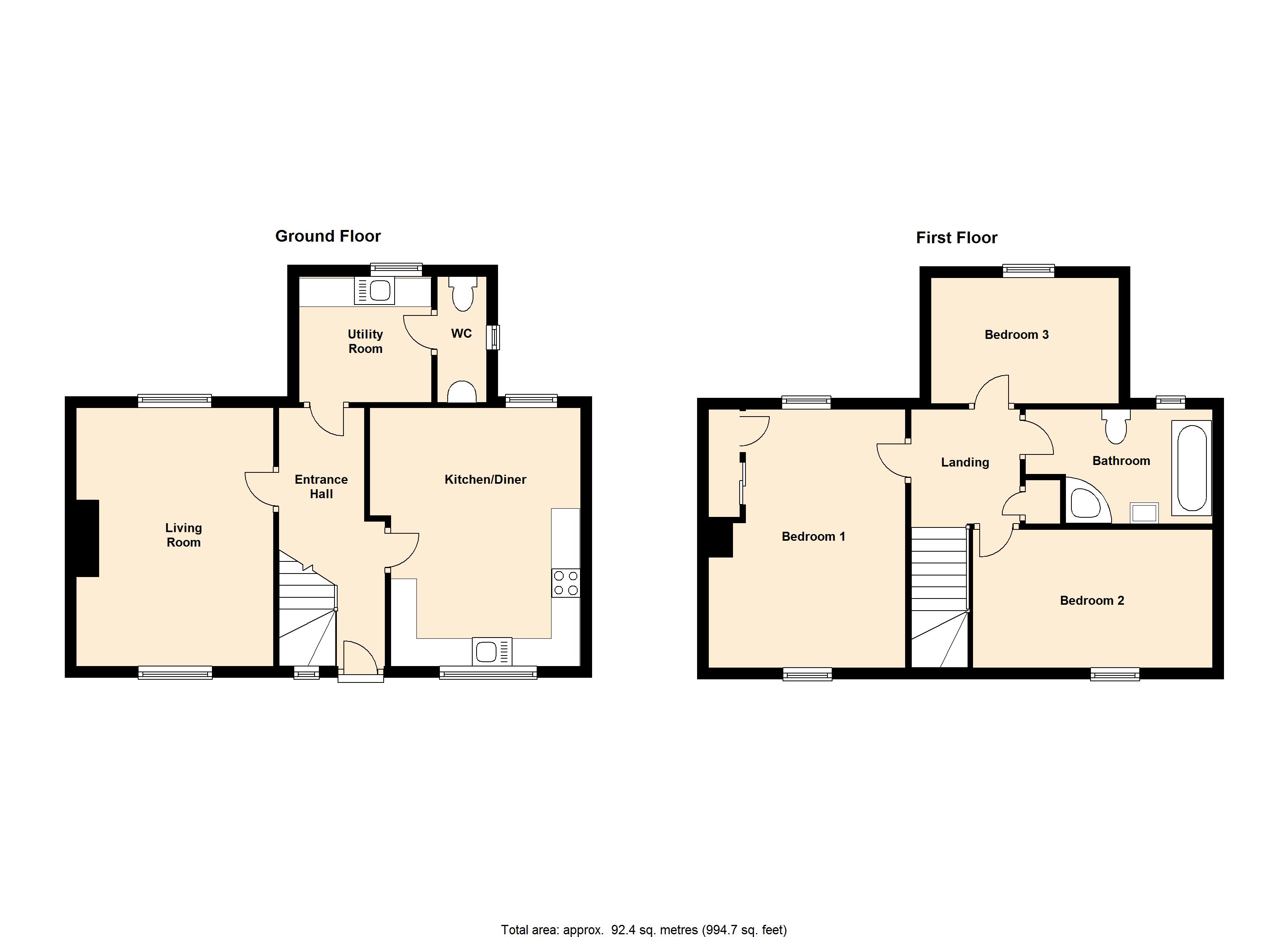 White suite comprising of low level WC, wash hand basin with tiled splashback, obscure double glazed window, extractor.