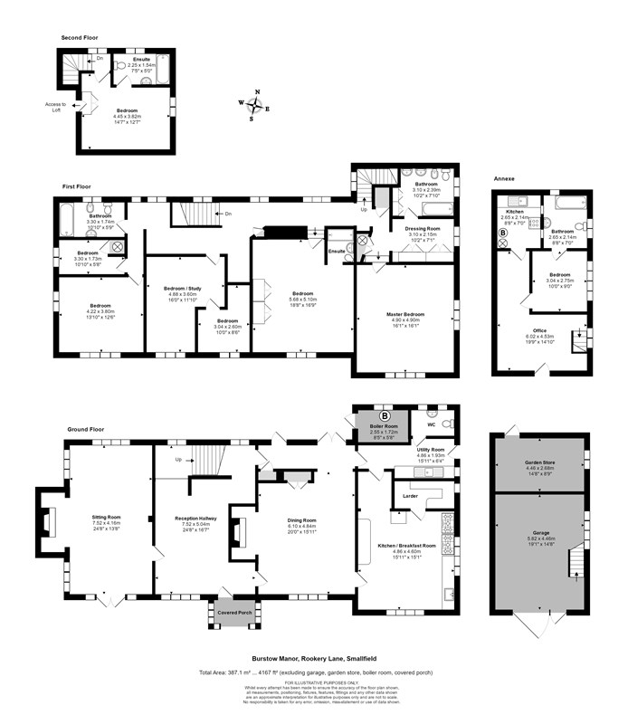 Separate from the house is a fine modern self contained annexe with garaging below; suitable as a home office or for staff the annexe has external stairway access. Further conversion of the garage beneath would create a