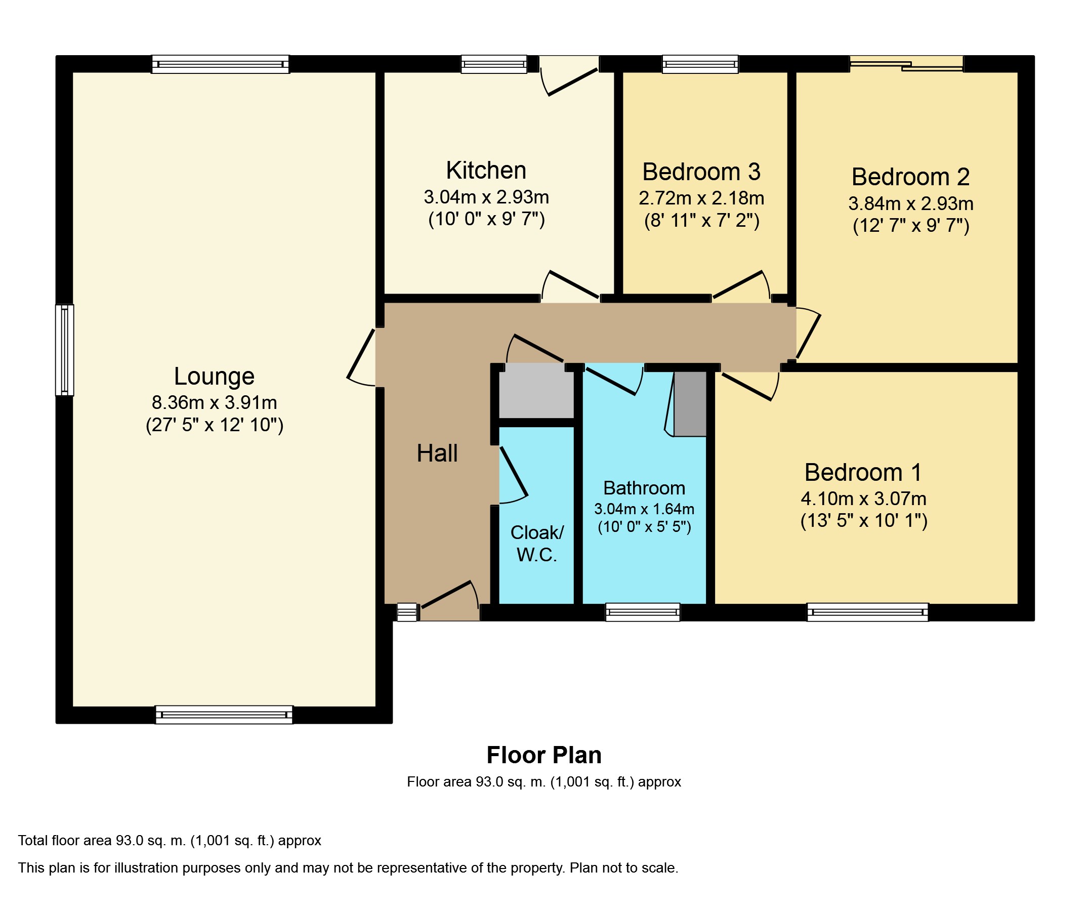 Cloakroom Fitted with a pedestal wash hand basin, low flush wc and mirror. Part tiled walls and uPVC obscure double glazed window.