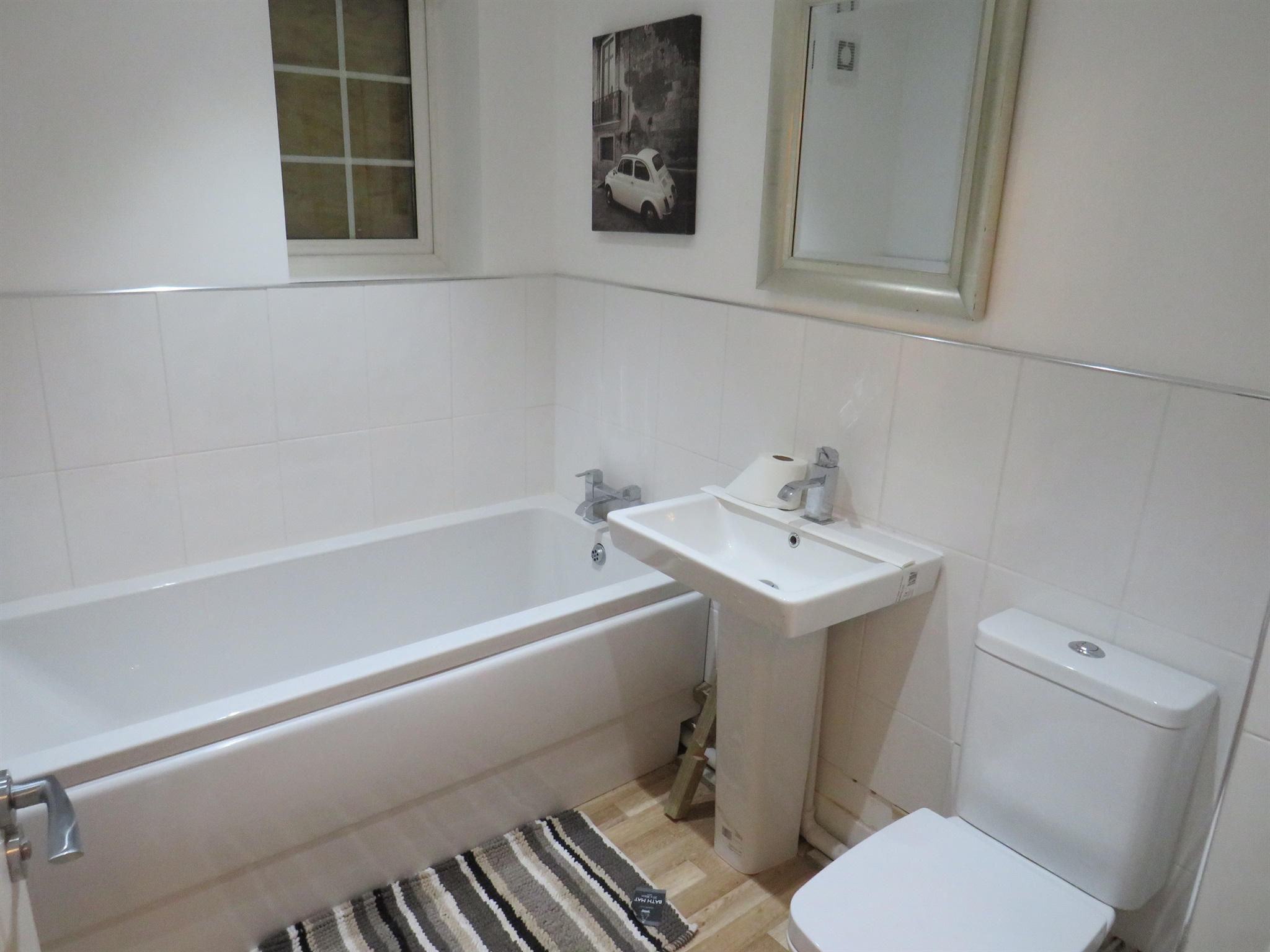 Double glazed frosted window to the side, three piece suite compromising of fitted bath, low level wc and a pedestal wash hand basin, half ceramic tiled, radiator.
