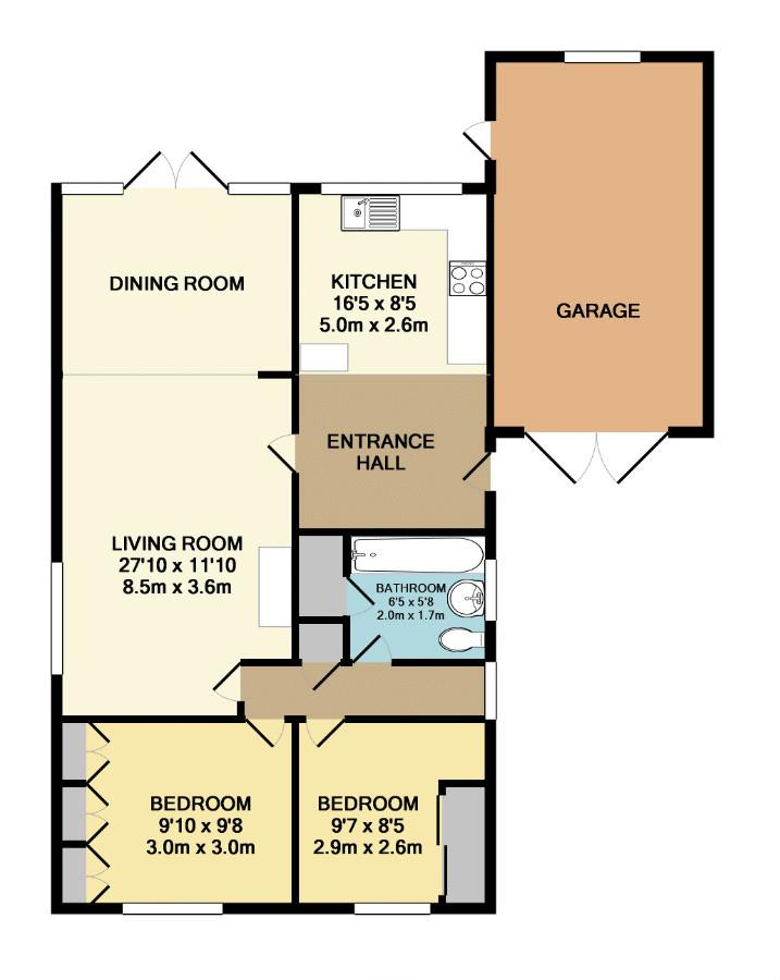The bungalow occupies a spacious corner plot with well maintained lawned gardens to both side and rear aspects with flower borders. Paved patio area and summer house. External power points, cold water tap. Timber and felt garden shed, courtesy lamp.