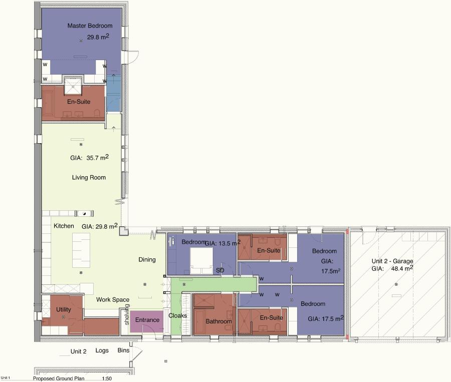 Master suite The master suite reached via a corridor leading away from the sitting room is a further extension of the industrial architecture that creates dramatic features incorporating beams and plentiful glazing. A door leads immediately out to the garden that with the addition of a decked patio a space can be provided to take your morning coffee in comfort whilst enjoying the rural countryside. The spacious ensuite is larger than most and includes a step in shower, dual sinks, bath tub and low level w.C. A substantial mirror adorns the fully tiled walls and natural light streams through the Velux window.