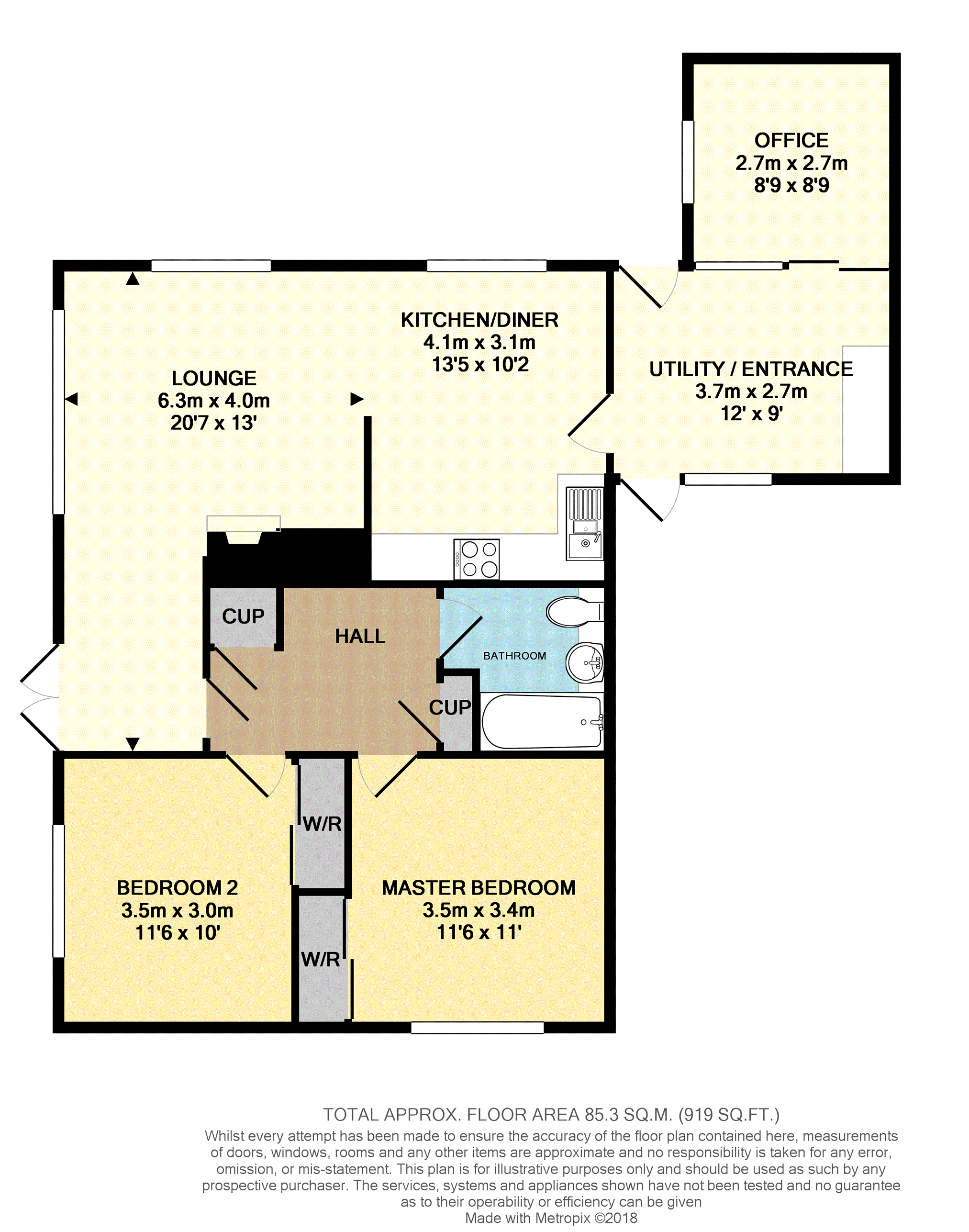 An entrance area / utility room having a secure entrance door into, a range of matching wall units and a base unit with a rolled edge work surface over, space and plumbing for a washing machine and tumble dryer, space for an upright fridge / freezer, wall mounted electric heater, tile effect laminate flooring, an entrance door to the rear garden, two windows to the front and rear elevations, a sliding door into the office and a door to the kitchen / diner.