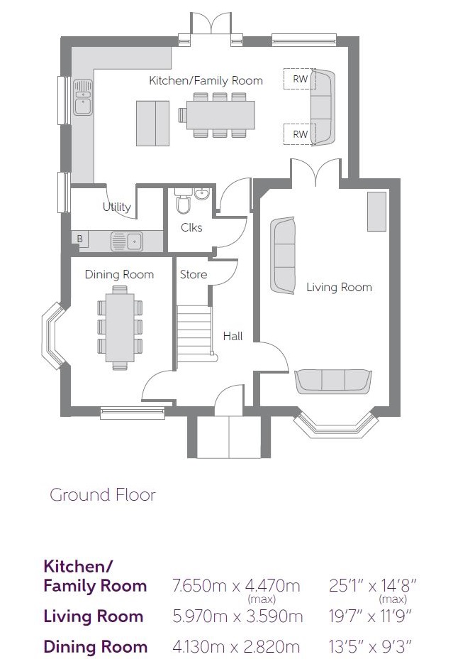 The separate double aspect Dining Room is found opposite the family lounge and ideal for formal dinner parties. This room benefits from a bay window to the side and a large front facing window which adds to a light atmosphere.