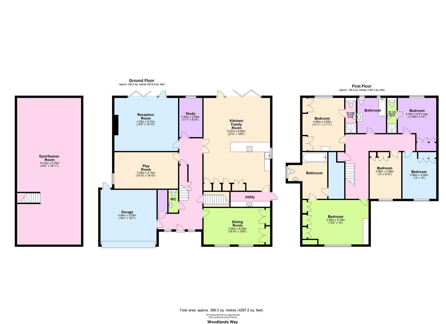 On the first floor there is a large master bedroom with en-suite bathroom and walk in wardrobe, two guest bedrooms with en-suite shower room, two further bedrooms with built in storage, airing cupboard and landing access to loft.