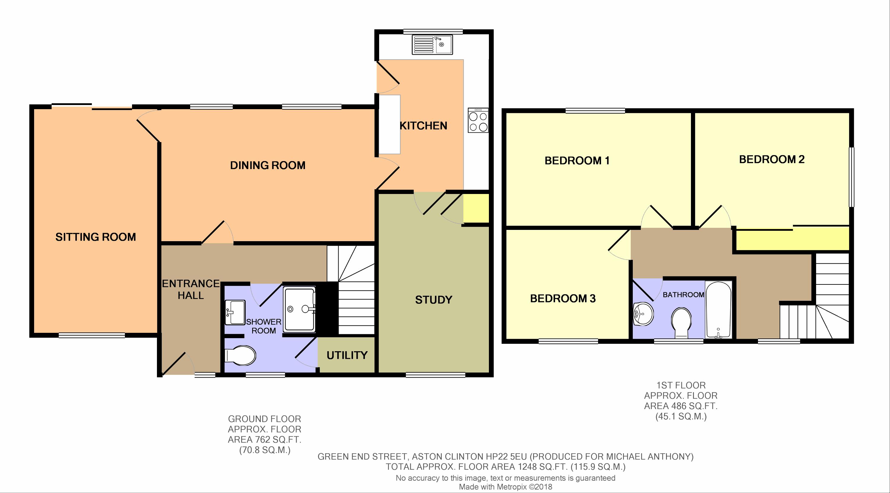 Fitted with a range of both floor and wall mounted units with work surface over, single drainer one and a half bowl sink unit with mixer tap, built in oven and hob with extractor fan over, plumbing for dish washer, tiled floor, part tiled walls, recessed spotlighting, radiator, door to study. Double glazed window and door to rear.