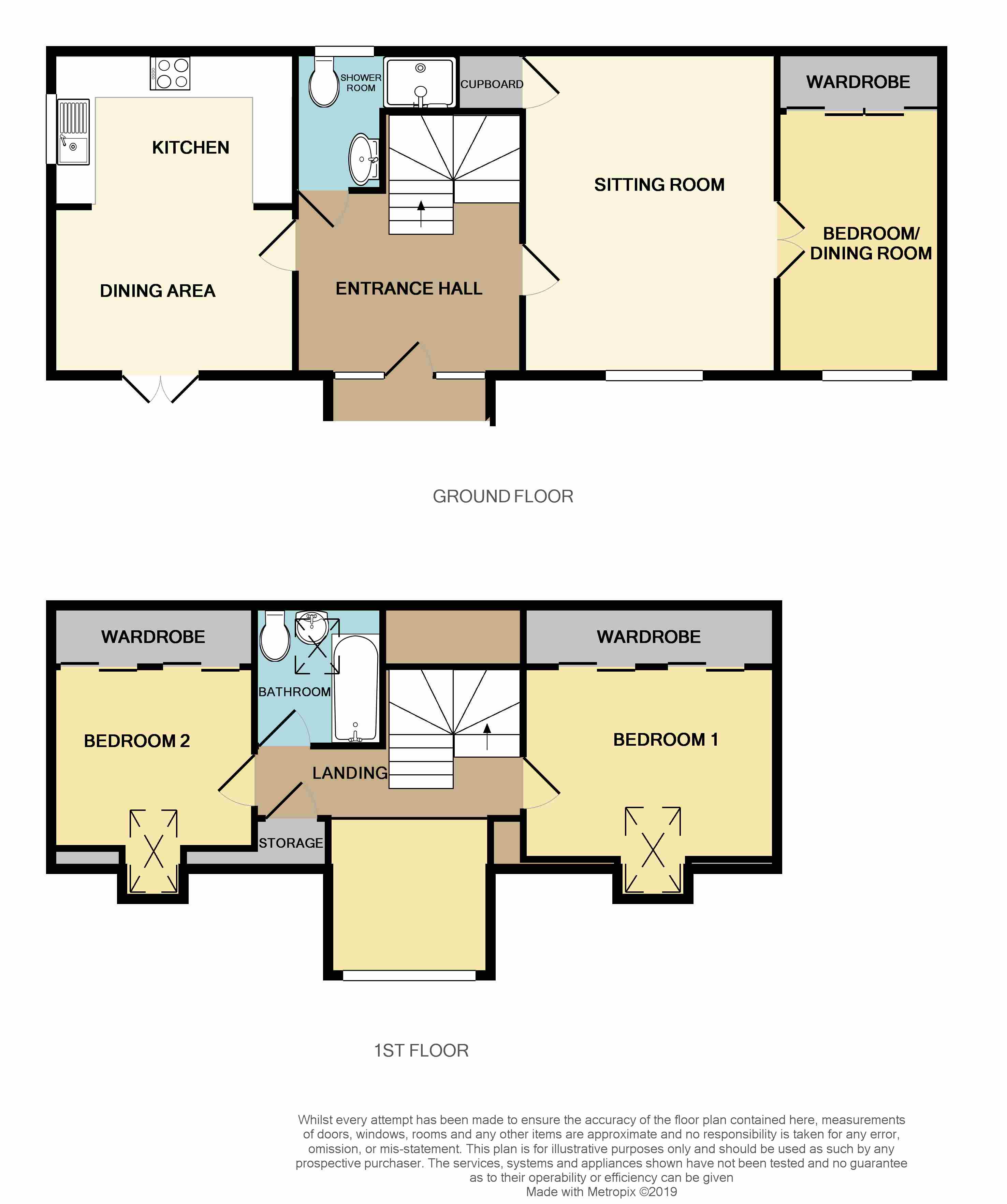Entrance Hall: Wood panelled entrance door, double glazed insert and double glazed window to the side, stair to first floor accommodation, tiled flooring, understairs cupboard and radiator.Downstairs Shower Room: Double glazed window to the rear elevation, corner shower with tiled surround and mains fed mixer shower over, vanity unity with inset wash hand basin with mixer tap and cupboards under, low level W.C, chrome heated towel rail, tiled flooring, part tiled walls and extractor fan.Lounge: 4.78m (15ft 8in) x 3.76m (12ft 4in) Double glazed window to the rear elevation, double radiator, television point, telephone point, walk in under stairs cupboard with wall mounted gas boiler supplying heating and hot water, double doors to:-Sitting Room/Bedroom 3: 4.83m (15ft 10in) x 2.64m (8ft 8in) Double glazed window to the front elevation, double glazed roof light, vertical radiator and two wall lights.Kitchen/Diner: 5.08m (16ft 8in) (total Including kitchen) x 3.96m (13ft 0in) Double glazed double doors to the front elevation, double glazed window to the side elevation, fitted with a range of wall, base and drawer units with wooden worksurface over, inset 1 ½ bowl stainless steel sink unit with mixer tap over, inset double oven and 4 ring gas hob with stainless steel extractor fan over, slimline dishwasher, built in fridge, freezer and washing machine, additional full height cupboards in the dining area with additional fridge, larder cupboard and shelved cupboards, tiled flooring, vertical radiator, spot lighting and dimmer switch.Dining Area: 5.08m (16ft 8in) x 3.96m (13ft 0in) First Floor Landing: Feature double glazed window to the front elevation with fitted wooden blinds, built in cupboard and double radiator.Bedroom 1: 3.71m (12ft 2in) x 2.69m (8ft 10in) excluding built in wardrobeDouble glazed windows to the side and double glazed Velux roof light to the front, built in wardrobes along one wall with shelving and hanging space, double radiator.Bedroom 2: 2.9m (9ft 6in) x 2.69m (8ft 10in) excluding built in wardrobeDouble glazed Velux roof light, built in wardrobe with shelving and hanging space, double radiator.Bathroom: Double glazed Velux roof light, three piece suite comprising: Panelled bath with mixer tap and mains fed shower over, pedestal wash hand basin, low level W.C, tiled flooring, part tiled walls, chrome heated towel rail, spot lighting and extractor fan.Outside: Double wooden gates to driveway with parking for 2/3 cars, enclosed by stone wall and lap fencing. Spacious patio area with stone resin and block paved edges, well stocked borders with a selection of shrubs and small trees, outside lighting. Addition pathway and borders to the side, water tap and gravelled area to the rear.