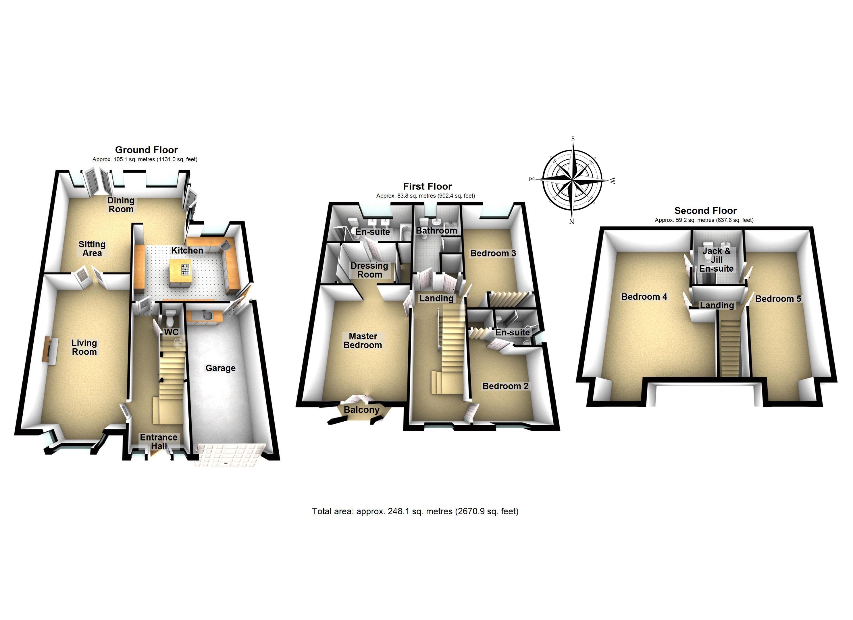 On the first floor, a spacious landing (with storage) accommodates three of the five bedrooms on offer; a luxurious master suite and two further double bedrooms (with fitted wardrobes), one served by an en-suite shower room and the other, an adjoining four-piece bathroom with a bathtub and a separate shower enclosure. One bedroom is also supplemented by a favourable south-facing aspect.