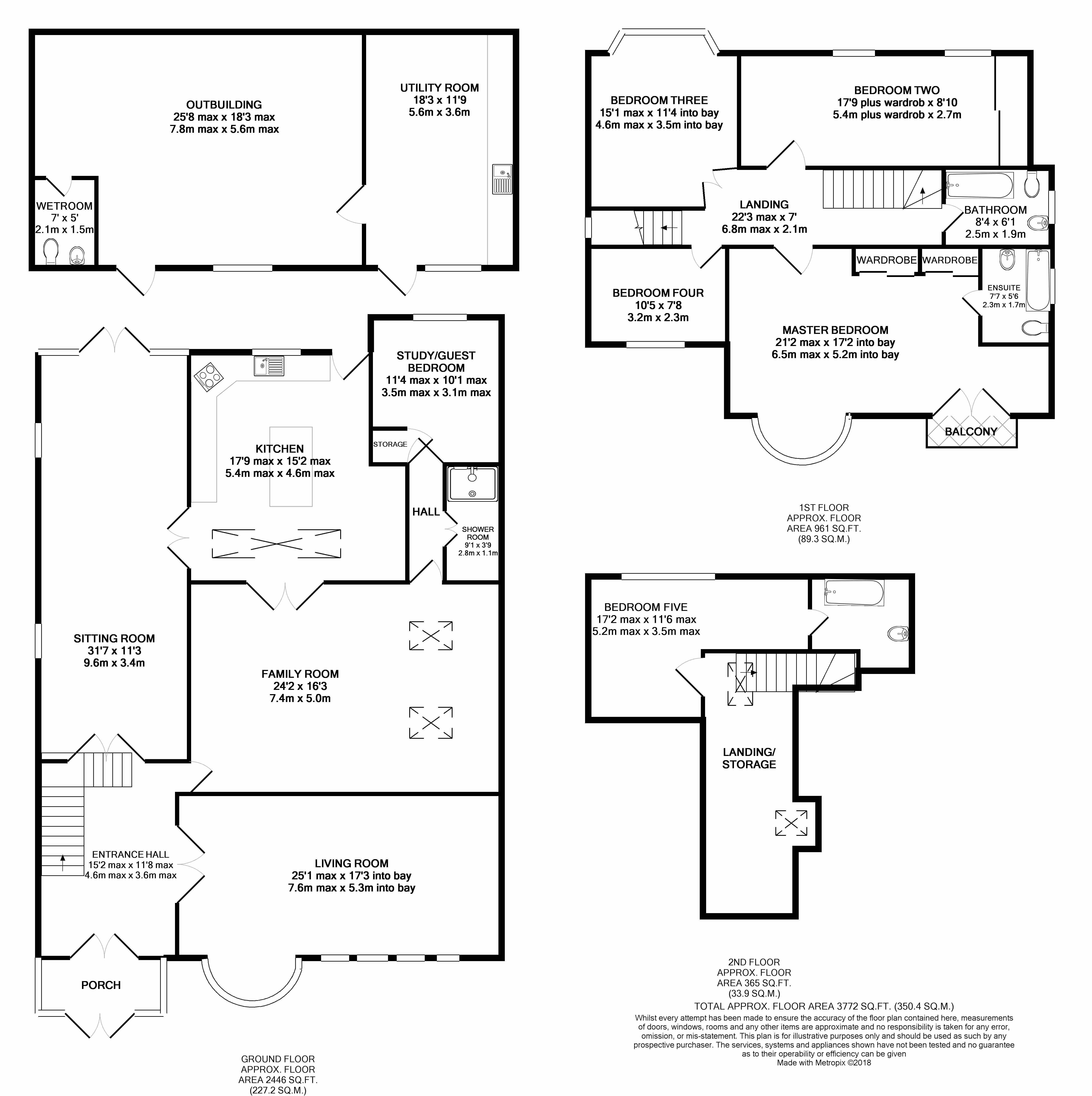 A superb opportunity to purchase this large Five/Six bedroom detached family home. Internally the ground floor features a welcoming hallway, three spacious reception rooms-living room, rear facing sitting room and dining/family home, modern fitted kitchen-including appliances of fridge/freezer, dishwasher, integral microwave, double oven and coffee maker. A shower room with contemporary fittings is adjacent to a study which is used as a guest bedroom also. Upstairs boasts three double bedrooms with fitted wardrobes and the master benefitting from balcony and en-suite to compliment the modern family bathroom complete with shower above bath. Further stairs lad to bedroom Five and en-suite bathroom. The property benefits from double glazing and gas central heating, spacious front driveway securely access with electronic controlled gates and a large rear garden. There is a spacious and intriguing rear outbuilding currently used as storage, but could have multi uses from office to family rooms to potential annex. Buyers will be pleased to know that further modernisation would enhance further.