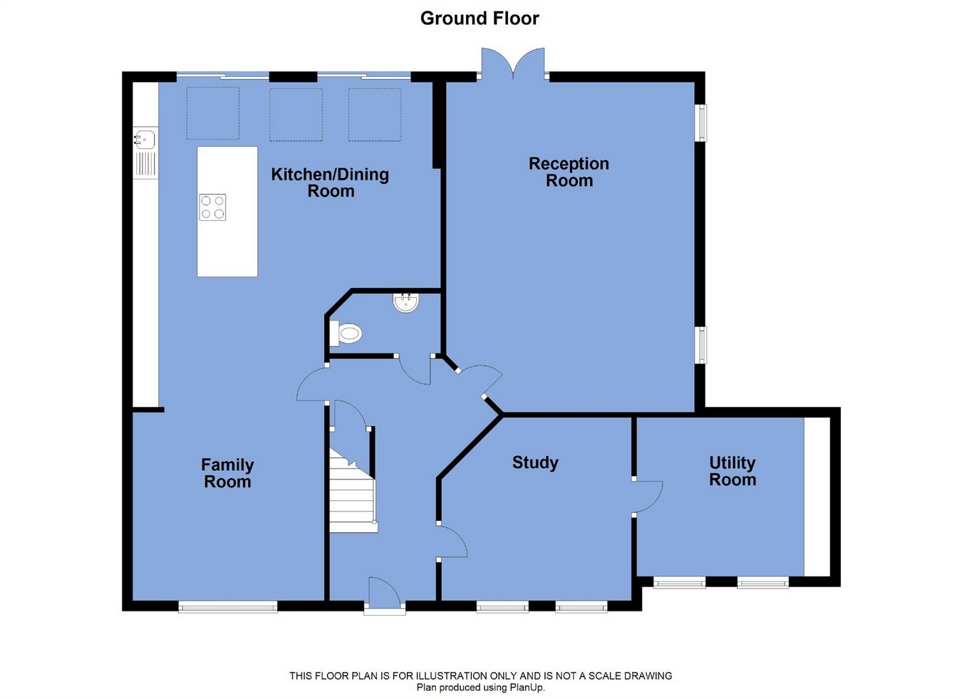 The large open-plan kitchen, living and dining area is fitted with wall and base units in grey gloss, is fully loaded with appliances and finished with Corian worktops. The separate formal lounge is well-proportioned and includes feature vaulted ceiling with Velux roof light and a log burner and both these primary rooms benefit from under floor heating. In addition to this the ground floor includes a fully fitted study and large utility room with storage.