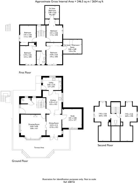 The large entrance hallway provides access to a drawing room, cloakroom and an oak staircase to the first and second floors. The Drawing rooms main feature is the large brick built fireplace with log burner and sliding doors opening into the dining room, which has double doors opening out onto the south-facing terrace and a study which can maybe be used as a 5th bedroom, the sellers inform us that there is plumbing in place to facilitate an en-suite. The spacious kitchen has good storage with granite work top surfaces over, double sink, integrated oven, grill, dishwasher, a gas/electric hob with extractor over; from here there is access to the utility room, with side access benefitting from ample storage and plumbing for utilities.