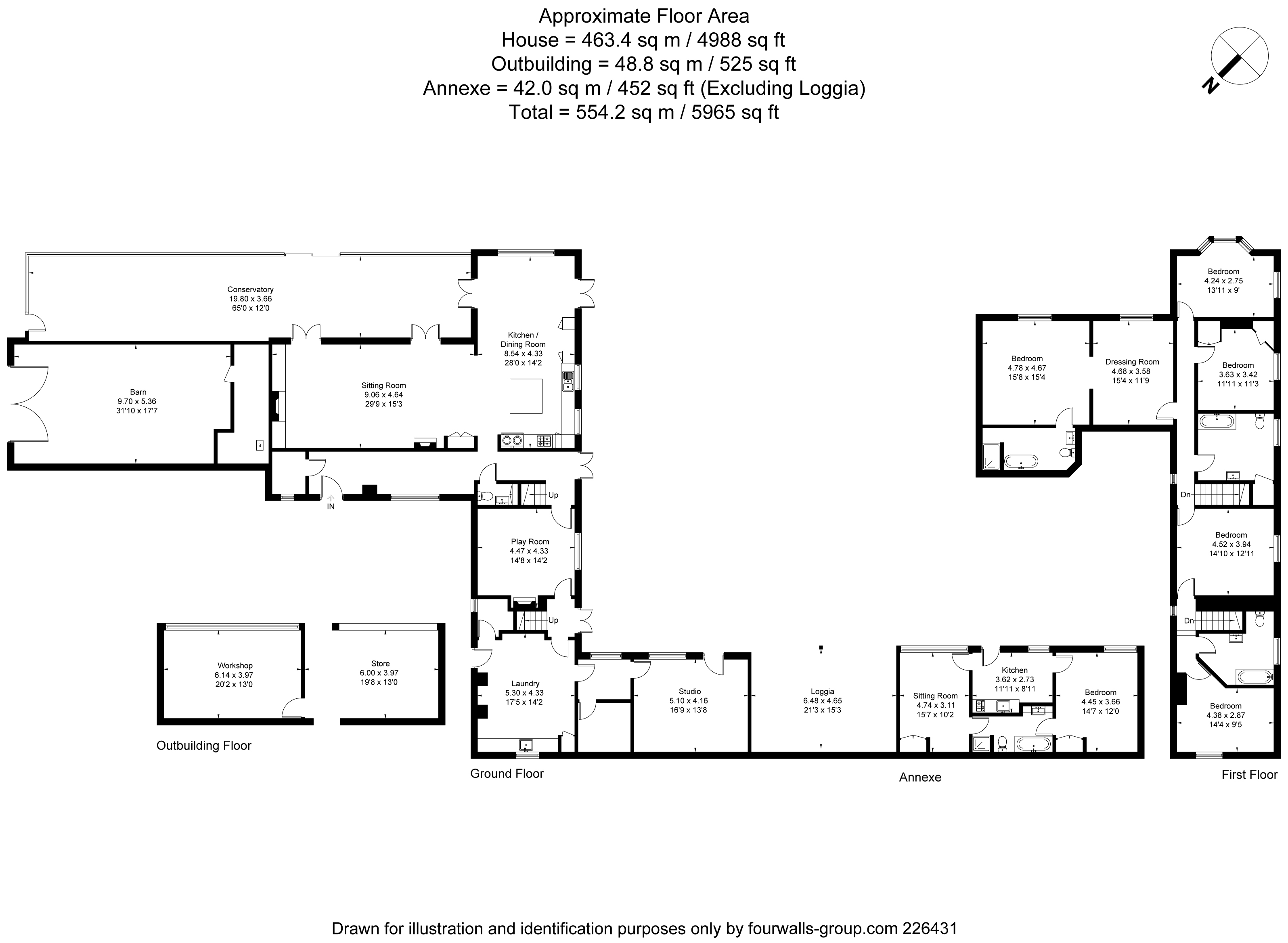 The ground floor continues through a playroom with wood-burning stove, to a large utility room, separate pantry/store and studio. An external gravel path continues past an open-front loggia to a self-contained annexe with kitchen, sitting room, bedroom and jack-and-jill bathroom.