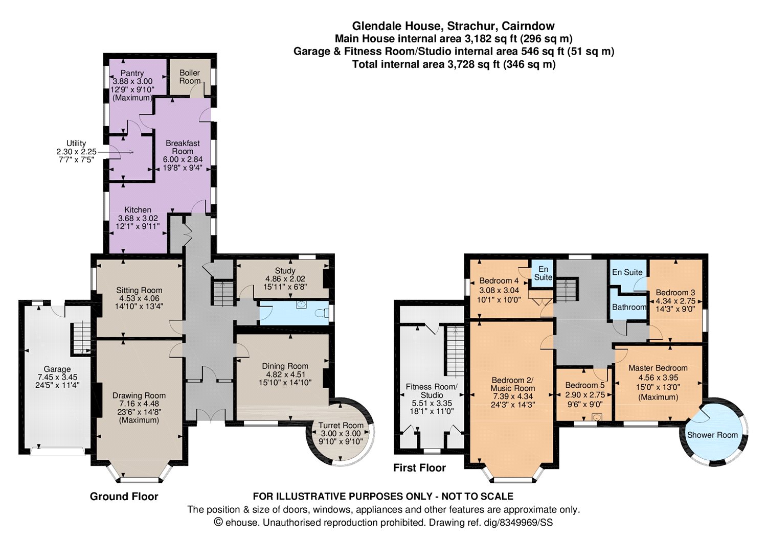 A period staircase leads from the hall to a half landing with a large stained glass window. On the first floor there is a master bedroom with an en-suite shower room cleverly installed in the turret. There are three further bedrooms, one with an en-suite shower room and one with an en-suite bathroom. There is also a family bathroom. A generously proportioned music room is also to be found on the first floor. This has a fantastic bay window and could easily be furnished as a spectacular further bedroom.