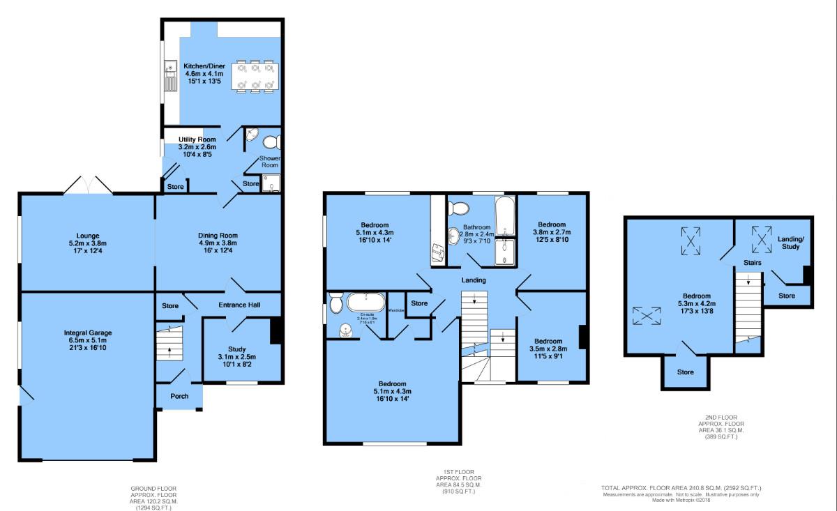 The accommodation (well over 2000 sq ft) comprises: - open porch, entrance hall, study, lounge, dining/family room, utility room, downstairs shower room/ WC, fitted kitchen/diner, four first floor bedrooms, en-suite bathroom/WC to master bedroom, a separate combined family bathroom/WC with bath and sep shower and a second floor 5th bedroom with landing/study area.