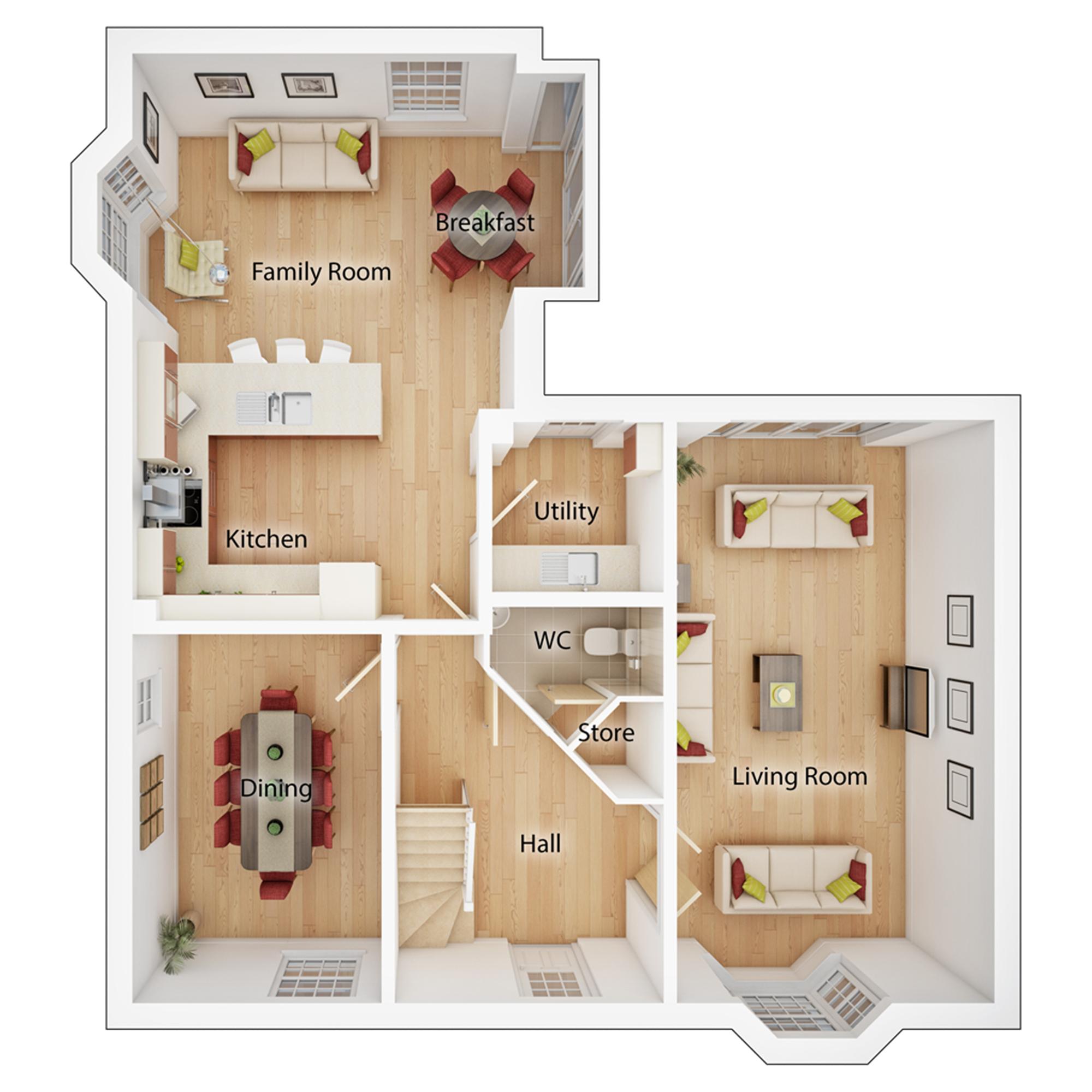 Moorecroft, plot 421 at hollygate park | This 5 bedroom detached homes features an open plan dining kitchen with French doors leading to the garden, separate dining room, spacious lounge, 5 double bedrooms with 2 en suite bathrooms and a large creative space on the top floor.