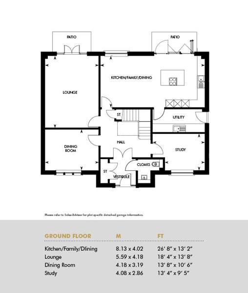 The thoughtfully designed MacRae combines deluxe detached living with the added benefit of a separate double garage. On the ground floor, a vestibule with storage and a cloakroom is the perfect place to greet guests. From here, and accessed via a spacious hallway, is a study, dining room, formal lounge and an open plan kitchen and family/dining area. French doors to the lounge and bi-folding doors to the kitchen further extend the living space onto the patio area and rear garden. Upstairs is a luxurious bathroom with a separate shower enclosure, and five elegant bedrooms. The glorious master bedroom features an en suite shower room and spacious dressing area. Two of the remaining four bedrooms benefit from fitted wardrobes, and one has an en suite shower room.