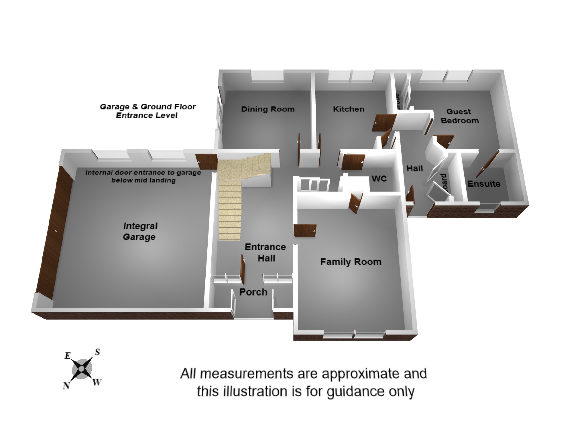 This level is complete with a handy cloaks / WC with white 2 piece suite. The lower level provides door access to the large integral double garage with power and plumbing for further white goods as well as an electronic power assisted double garage door.