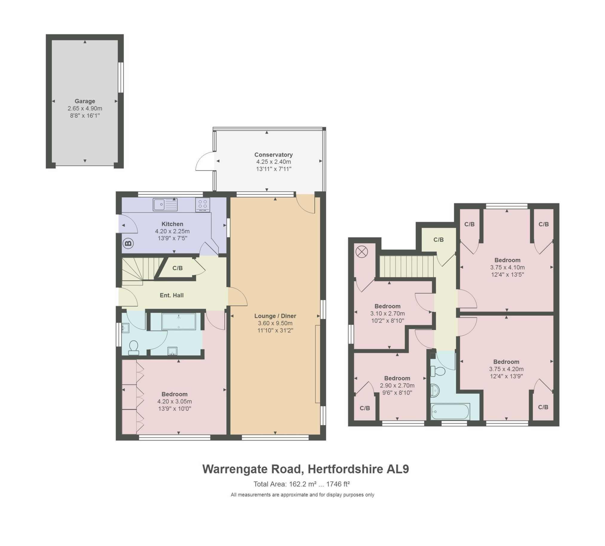 En-suite/Downstairs Cloakroom : Frosted window to side. Wash hand basins. Fully tiled. Shower cubicle. Low Level WC. Vinyl flooring.