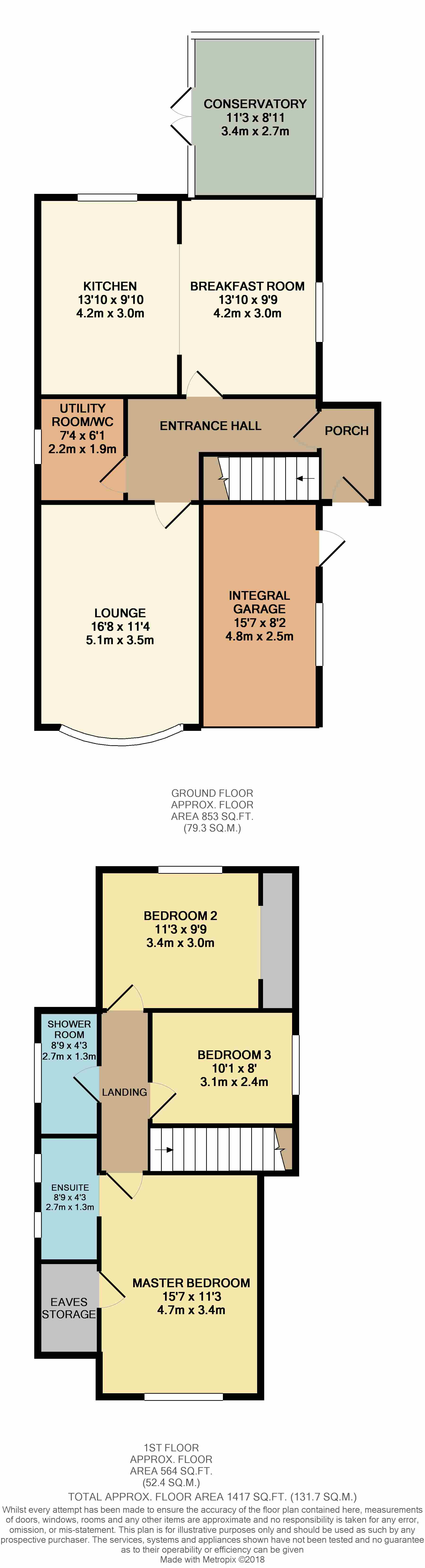 Ground floor cloakroom/utility 7' 4" x 6' 1" (2.24m x 1.85m) Obscure double glazed window to side aspect. A two piece suite comprising wall mounted wash hand basin and low level wc. Part tiled walls. Heated towel rail. Base and eye level units with space and plumbing for washing machine. Coving to plastered ceiling. Extractor fan.