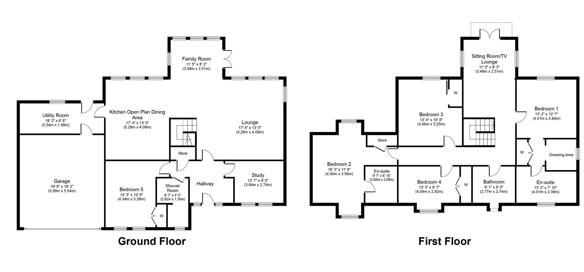 Internally the versatile living accommodation over 2 levels comprises on the ground floor; reception hall, lounge open plan to a superb family/dining room with French doors leading out to the rear patio, open plan kitchen/dining area, utility, double garage, bedroom 5, shower room and study. Upstairs there is a fine galleried landing which is open plan to an impressive sitting room/TV lounge, fine master bedroom with dressing room and en-suite, guest bedroom with en-suite, 2 further double bedrooms and family bathroom. All rooms are impeccably presented with fresh tasteful décor complimented by quality fitted floor coverings which are included in the sale. Specification is to an excellent standard and includes stunning bathroom and en-suites with Porcelanosa tiling, quality fitted kitchen with integrated Neff appliances. Warmth is provided by an air source heating system with under floor heating and also solar pv panels.