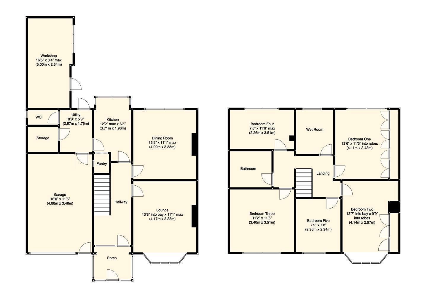 Stairs rise to the first floor landing which gives access to five bedrooms, bathroom and wet room. With carpet flooring, skylight and loft access.
