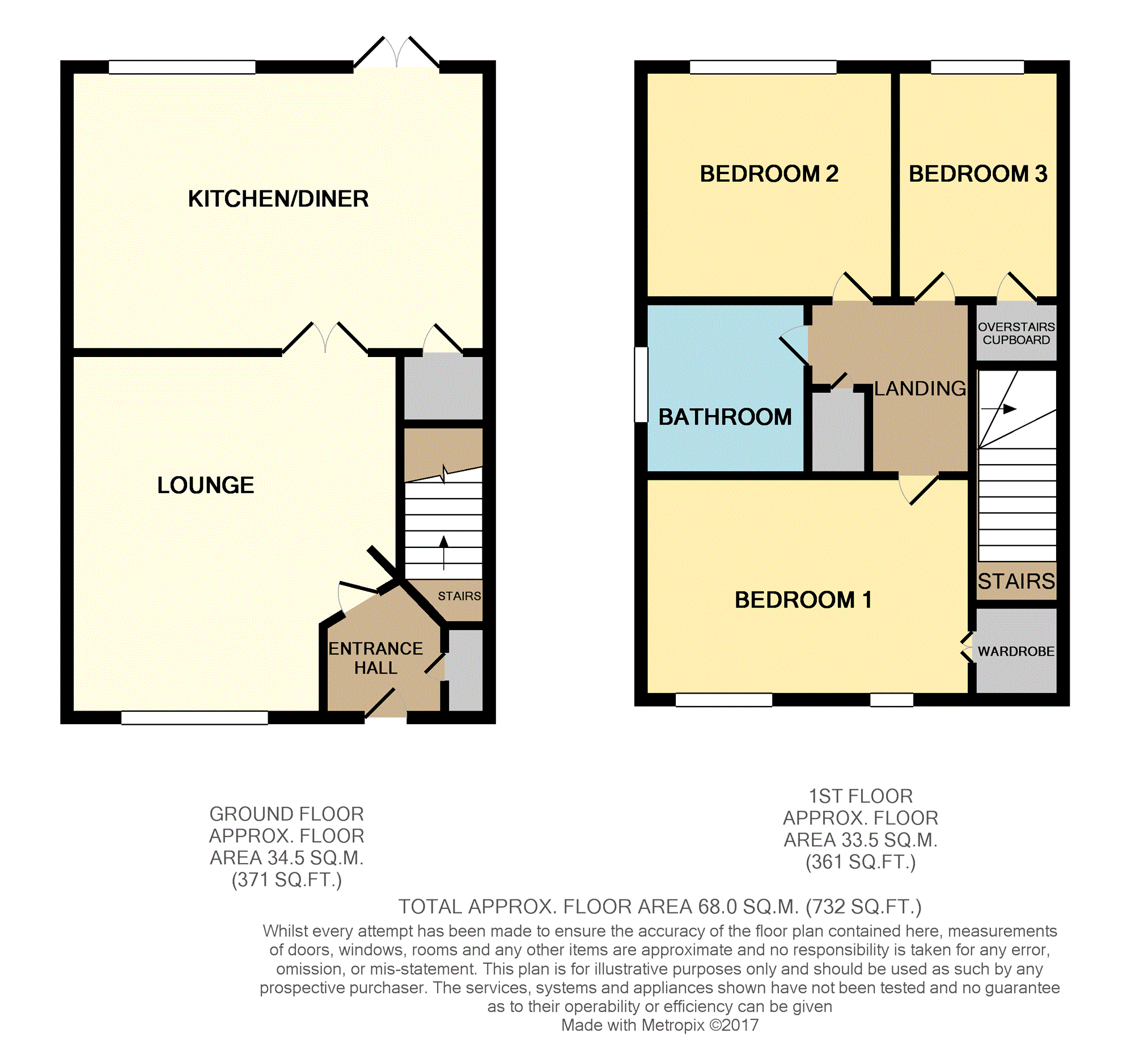 Stairs rise from the ground floor, and door lead to the bedrooms and the bathroom.
