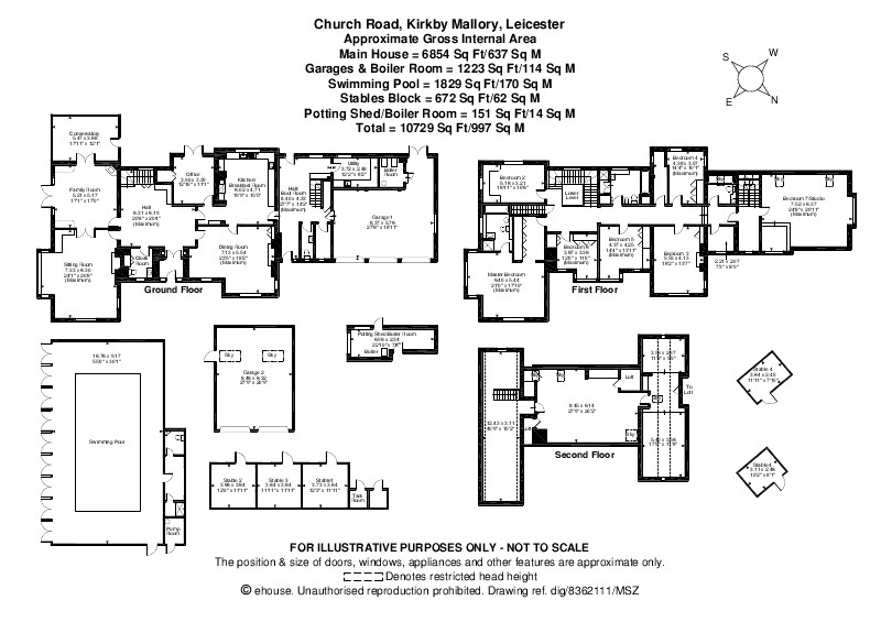 Imposing seven-bedroom detached home set in 6 acres (approx.) in the handsome village of Kirkby Mallory. This unique property affords a wealth of well-proportioned living accommodation and beautiful rolling countryside views. The internal layout is laid across three floors to comprise in brief; Entrance porch, reception hall, sitting room, family room, Study, kitchen, formal dining room, Conservatory, second Reception hall, utility room and cloakroom to the ground floor with seven bedrooms including one ensuite, study, playroom and two bathrooms to the first floor. There is office and studio on third floor. Externally the property affords 4.5 acres (approx.) paddocks & pasture land with stables, generous established front & rear gardens and gated driveway providing off road parking and access to integral triple garage. Additionally, there is Indoor Swimming pool, and detached double garage with separate gated drive.