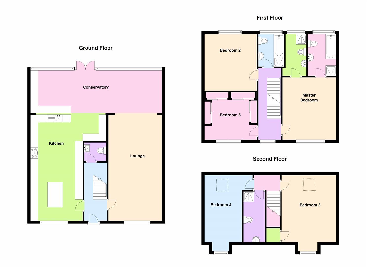The internal accommodation brieftly comprises; entrance hall, downstairs WC, dining kitchen, lounge, conservatory, first floor landing, three bedrooms with the master bedroom having two en-suites, family bathroom, second floor landing, two further double bedrooms and a shower room. Externally there are pleasant front gardens, off road parking for six vehicles, a double garage with utility to the rear and a low maintenance paved rear garden.