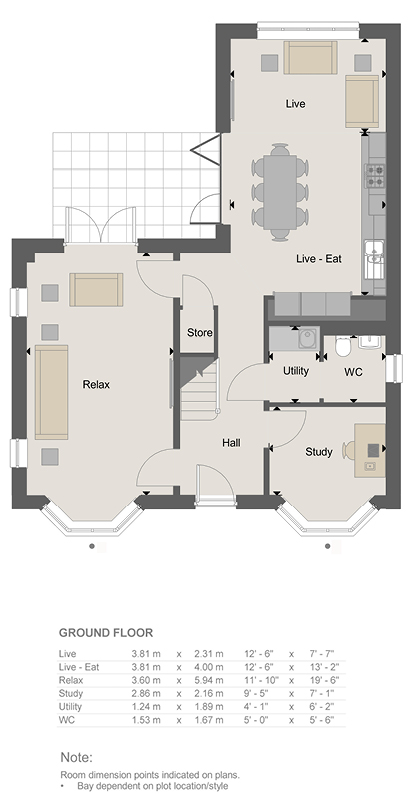 To the left of the wide hallway of The Tetbury is a spacious and light living room with bay window overlooking the front garden and French doors opening onto the back garden. To the right, as you enter, is a study. Beyond is a Milan-inspired kitchen, with integrated appliances and open plan dining and living area extending, through bi-fold doors, into the rear garden. In addition, you'll find a large WC, featuring contemporary full-height tiling, and utility room, with plumbing for a washing machine, and storage cupboard.