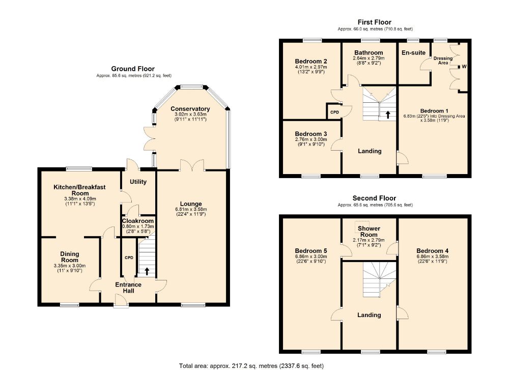 A well presented and improved three storey, five bedroom detached house situated on this extremely popular village development within an excellent school catchment area. Inside, the family accommodation includes a conservatory, kitchen/breakfast room that is open plan into the dining room, a large main bedroom, dressing area and en-suite shower room and on the second floor, two excellent bedrooms with a 'Jack & Jill' en-suite shower room. There is a double garage and parking. The property has UPVC double glazing, radiator heating and a burglar alarm.
