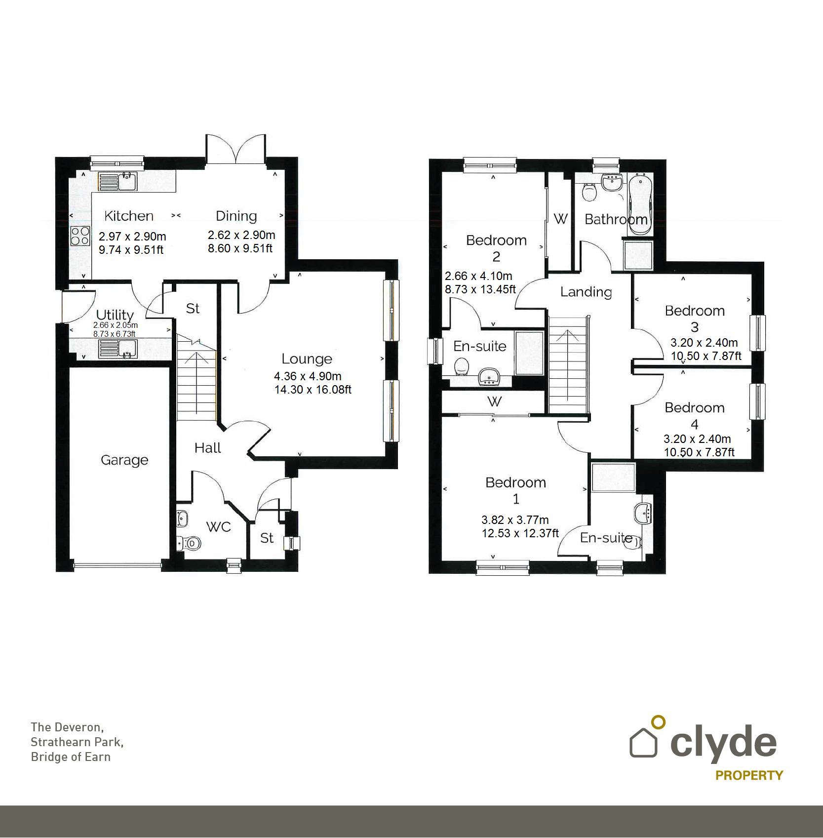 The Deveron is an elegant 4 bedroom detached villa comprising of lounge, kitchen/dining room with French doors to rear garden, utility room, downstairs WC. Upstairs has 4 sizeable bedroom, two with en-suites and fitted wardrobes, family bathroom. Single integral garage.