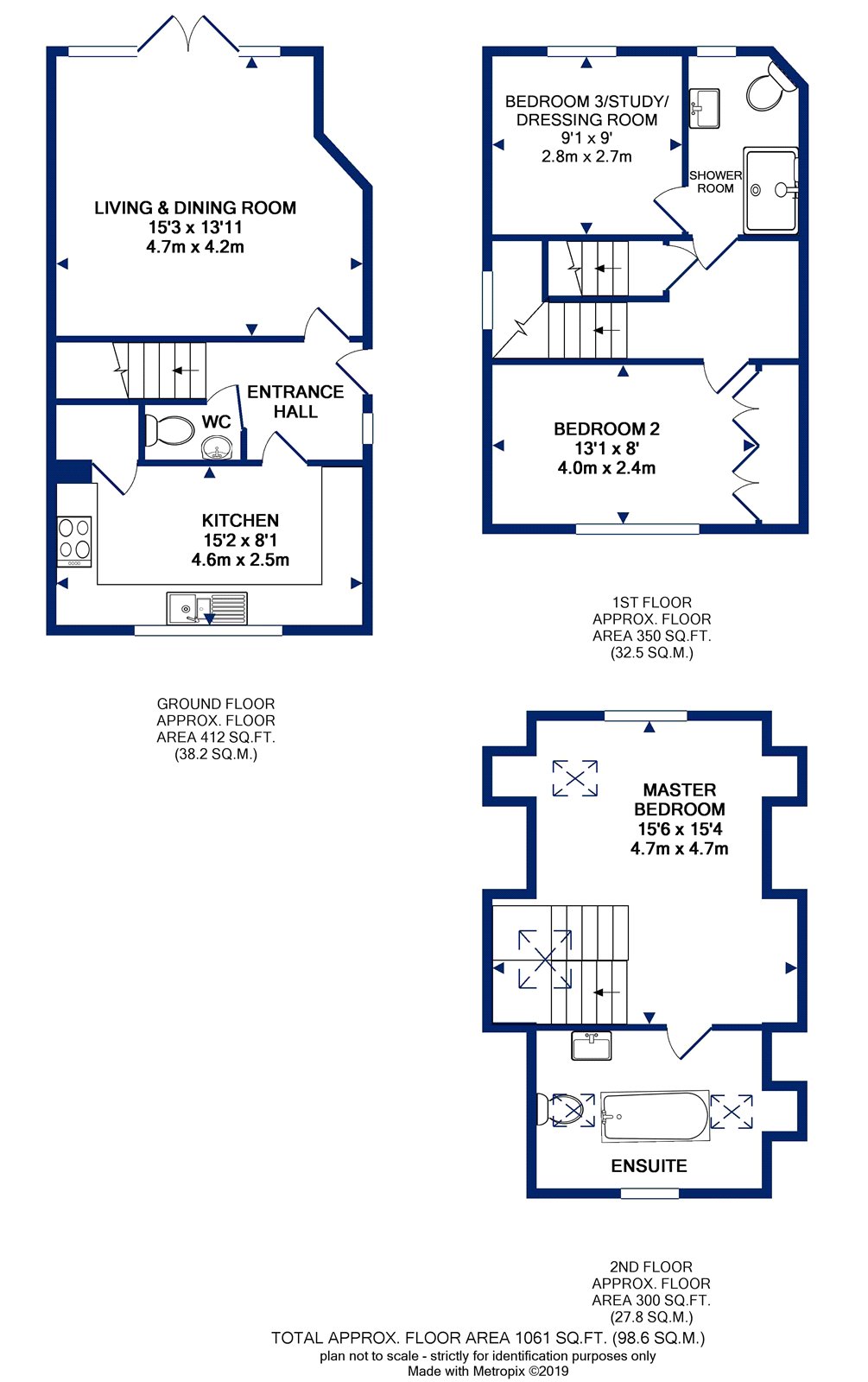 A solid wood turn staircase rises to the first floor with feature coloured glass window, bedroom two has fitted wardrobes and the house bathroom has shower enclosure and access through to the dressing room/occasional bedroom. To the second floor is the master bedroom with velux roof lights and ceiling spotlighting, leading through into a superb en suite bathroom with centre bath, sonte tiled floor and splash backs. Externally is a gated driveway to the front of the house and to the rear an enclosed lawned garden with raised decking.