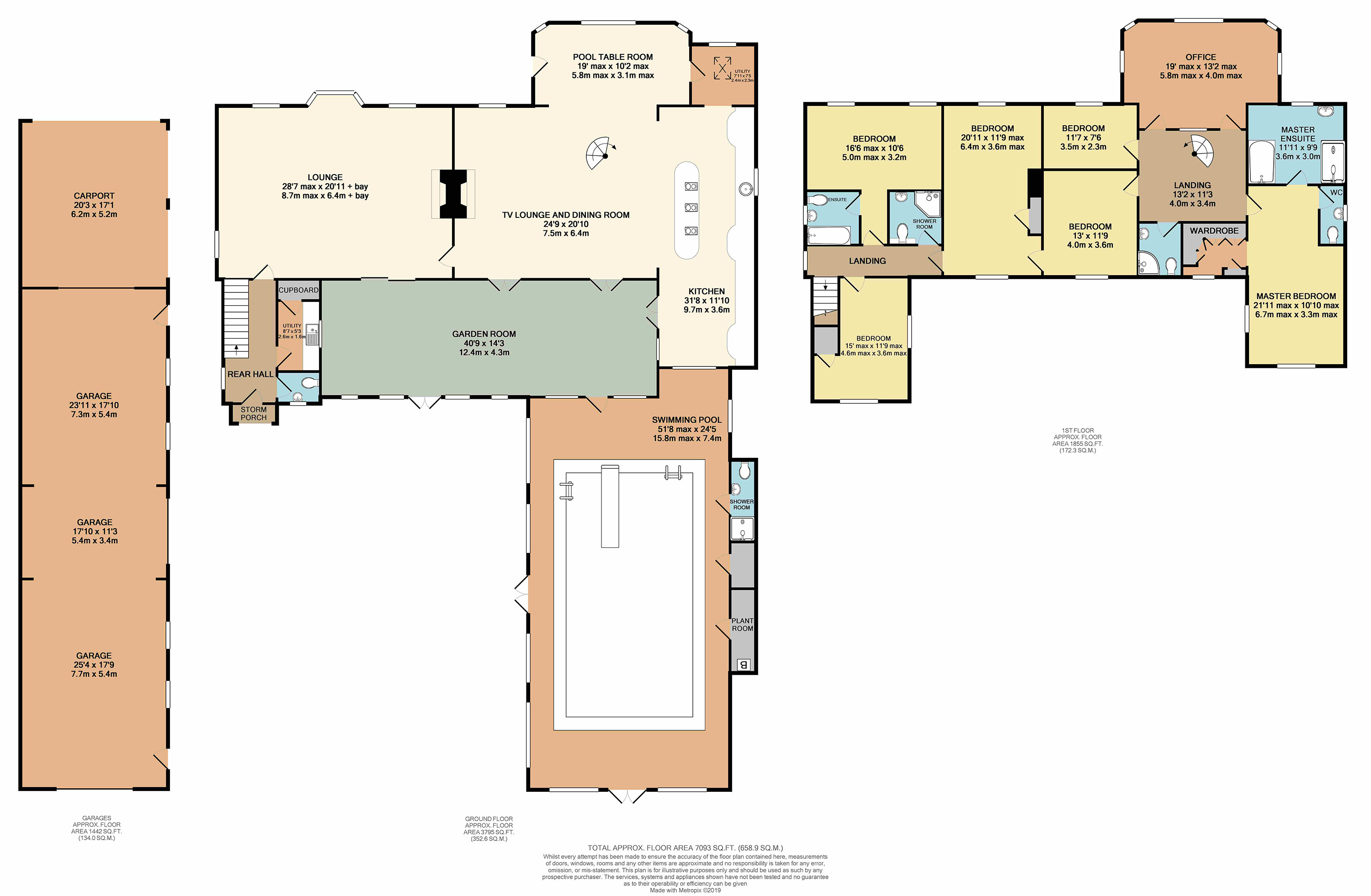 Upstairs holds 6 bedrooms including a large master with ensuite bathroom, separate WC and walk-in dressing room and a guest bedroom with ensuite bathroom. There are two further shower rooms and a spacious office with feature vaulted ceiling.
