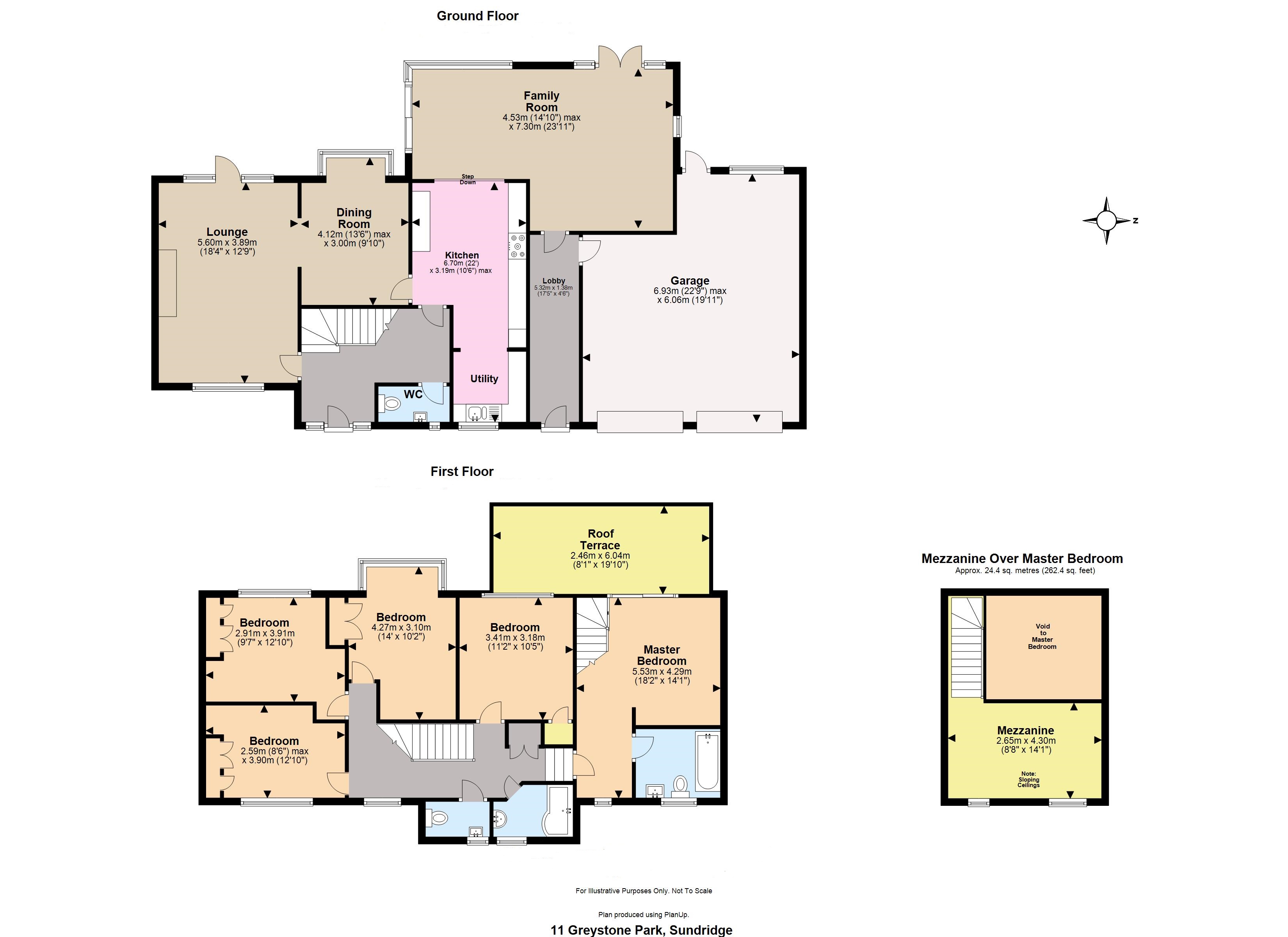 Upstairs are five double bedrooms which are serviced by a family bathroom and an en suite bathroom to the master bedroom. The master bedroom has access to a roof terrace and mezzanine floor which provides further accommodation.