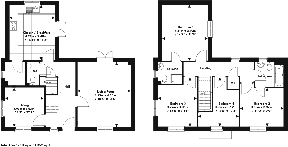 The Hyacinth is a spacious 4 bedroom family house (1,358 sq ft) with en-suite, separate kitchen/dining, and garage. From the entry hall, there's a separate living room, a WC and open-plan, fully-fitted kitchen/dining with integrated appliances, which leads out to the rear turfed garden.