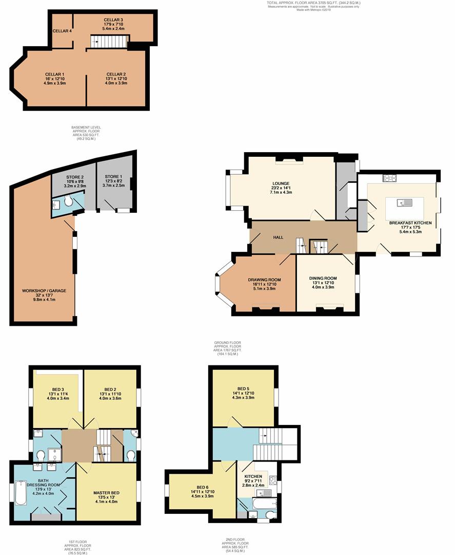Outbuildings and Cellars: Gardeners WC, storeroom 1, storeroom 2, garaging/workshop, cellar 1, cellar 2, cellar 3 and cellar 4.
