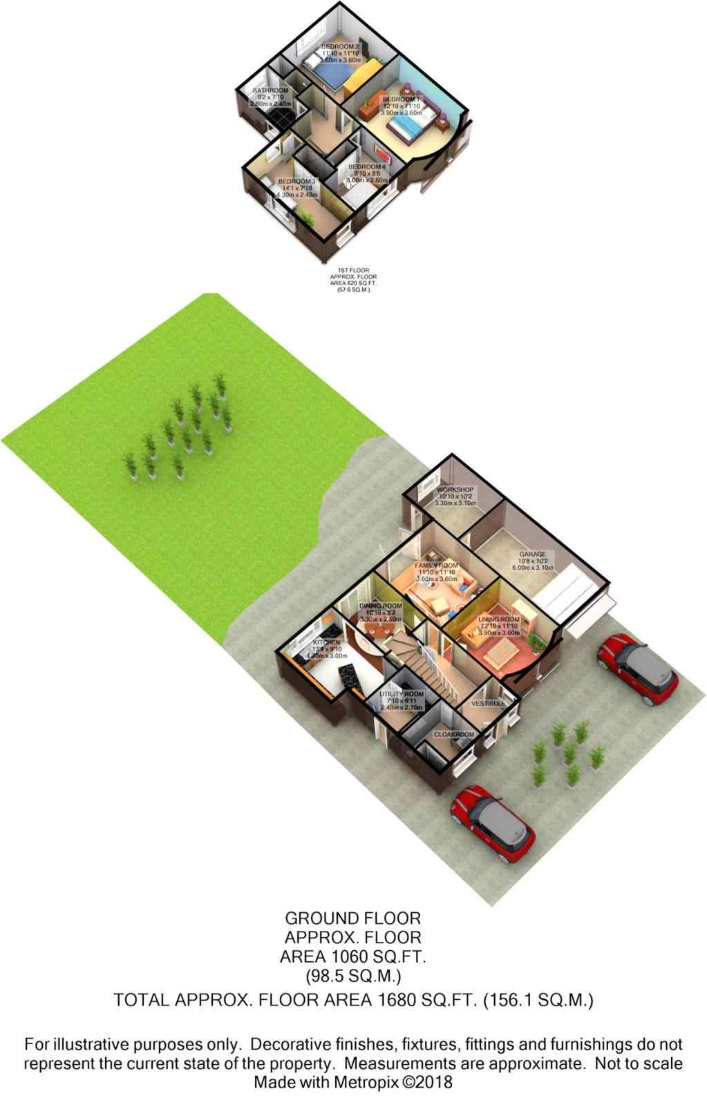 (internal) Large entrance hall, living room, family room, breakfast kitchen diner, utility room and downstairs cloakroom. Attached single garage + workshop. Upstairs there are 4 bedrooms and a family bathroom.