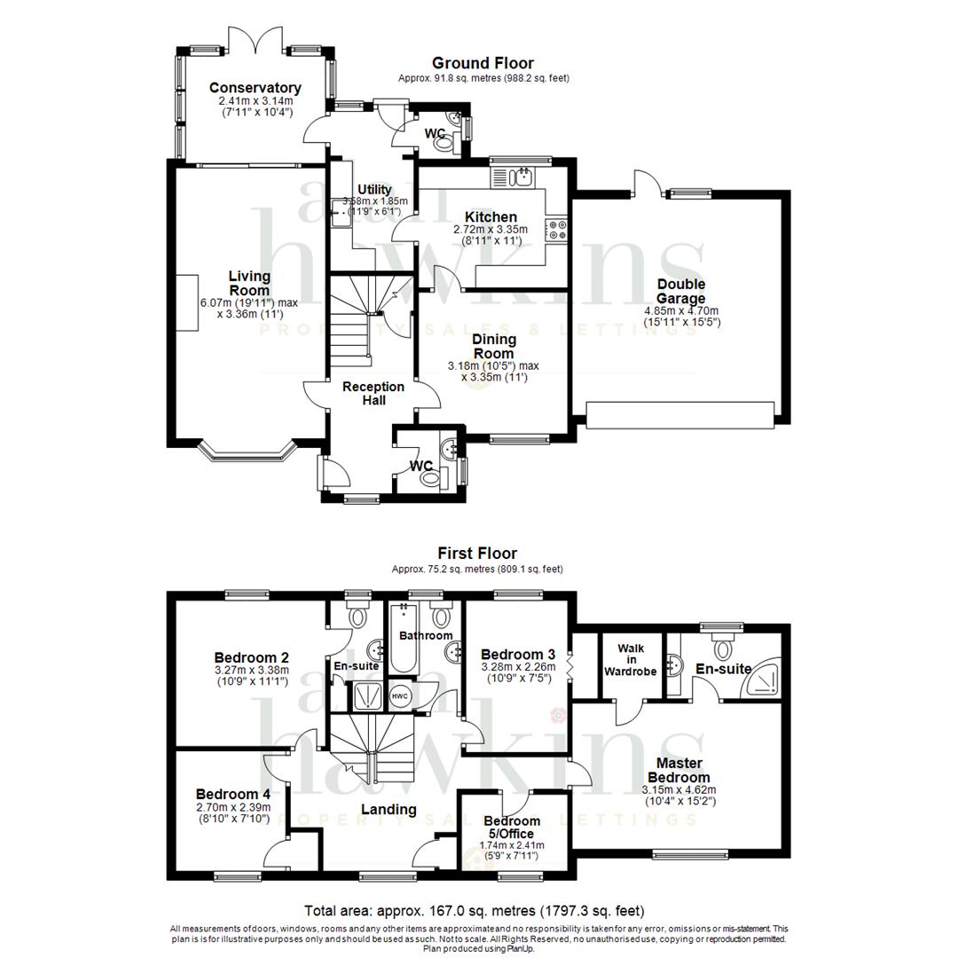 Internally the property consists of an entrance hallway with under stairs storage cupboard and W.C, bay windowed living room with patio doors to a conservatory, separate dining room, kitchen, utility room and a second W.C. To the first floor via a spacious landing are four good size bedrooms, the impressive master having an en-suite shower room and walk-in wardrobe, bedroom two benefiting a second en-suite shower room, a further two double bedrooms and a fifth perfect as a nursery or study/office.