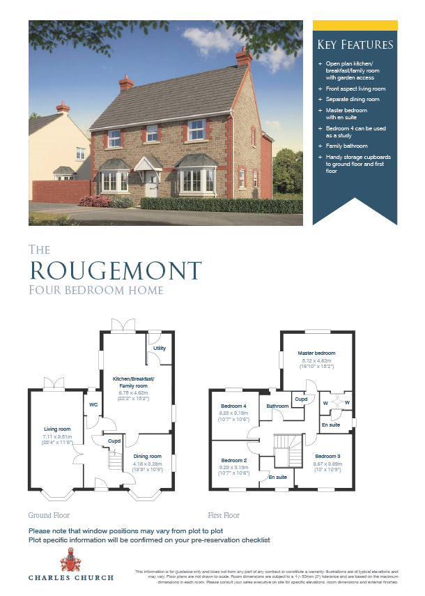 Barrington Park is a Charles Church built development of just 21 three and four bedroom homes in the popular village of Shrivenham. The Rougemont is a detached double fronted 4 bedroom home with detached double garage and 2 parking spaces. It's well proportioned accommodation includes an open plan kitchen/breakfast/family room with access to the garden. Front aspect living room, separate dining room, WC and utility room together with handy storage cupboard complete the ground floor. The first floor has 4 bedrooms with en-suite to the master and second bedroom and a family bathroom. The kitchen has integrated appliances, stainless steel gas hob, electric oven and a choice of kitchen units/worktops (subject to build stage). The family bathroom and en-suites have electric showers with an additional shower handset to main bathroom. This home is covered by the 10 year new home guarantee.