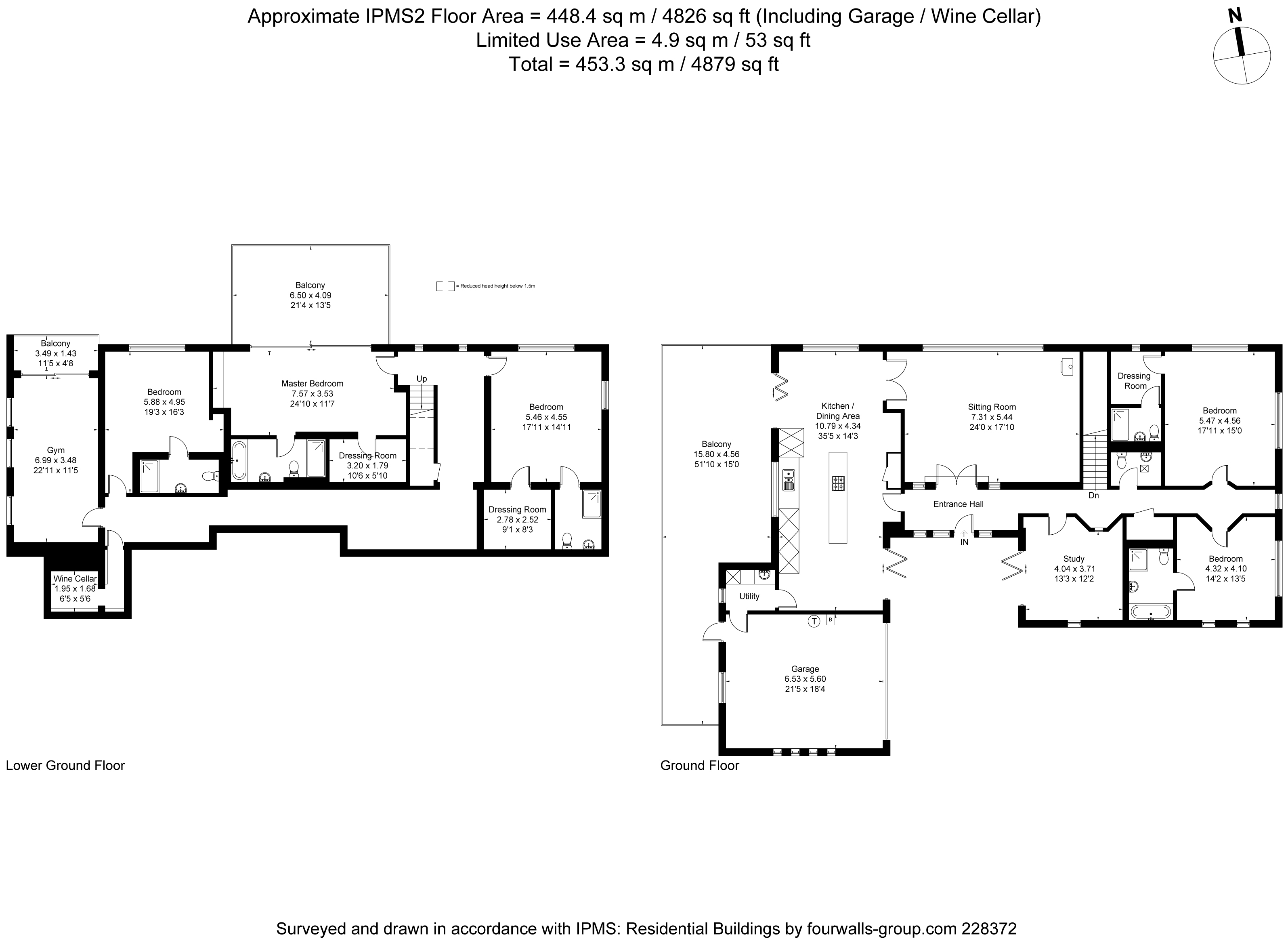 A dramatic staircase with glass balustrades, lit from the north by two strips of vertical glazing, leads down the lower ground floor. This part of the house is principally taken up by a master bedroom suite, with a large balcony beyond black-framed sliding glazed doors. The master bedroom also has its own en-suite bathroom and private dressing room. There are two further en-suite bedrooms on this floor, as well as a gym with a smaller private balcony, and a wine cellar, at the western end of the house.