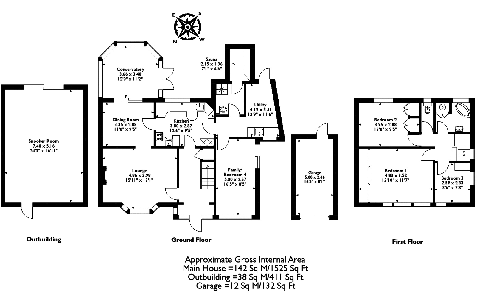 The utility room provides floor cabinets and an inset stainless steel sink, space and plumbing for a washing machine, tumble dryer and additional refrigeration. The utility room leads to a front aspect study/ground floor bedroom and a shower room with enclosed panelled shower, low level W.C. And door leading to the Sauna.