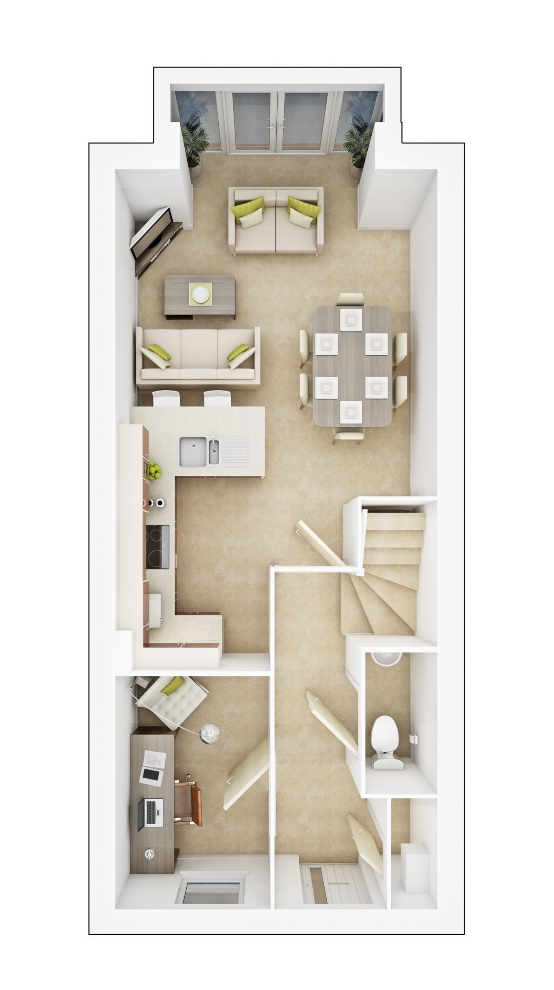 The Fawley is a three storey family home. The ground floor hosts an open-plan kitchen / dining / family room with French doors leading to outside space, with a separate study room too. Above, there is a cosy lounge room and bedroom one complete with en-suite. To the second floor there are two further bedrooms.